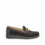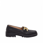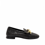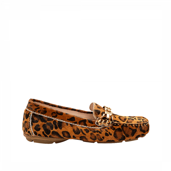 Mocasín con hebilla en cuero con acabado en pelo tipo animal print (el acabado del fondo es natural y puede variar según la piel)