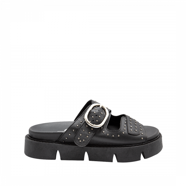 Sandalia plana con piedras decorativas en cuero negro ónix