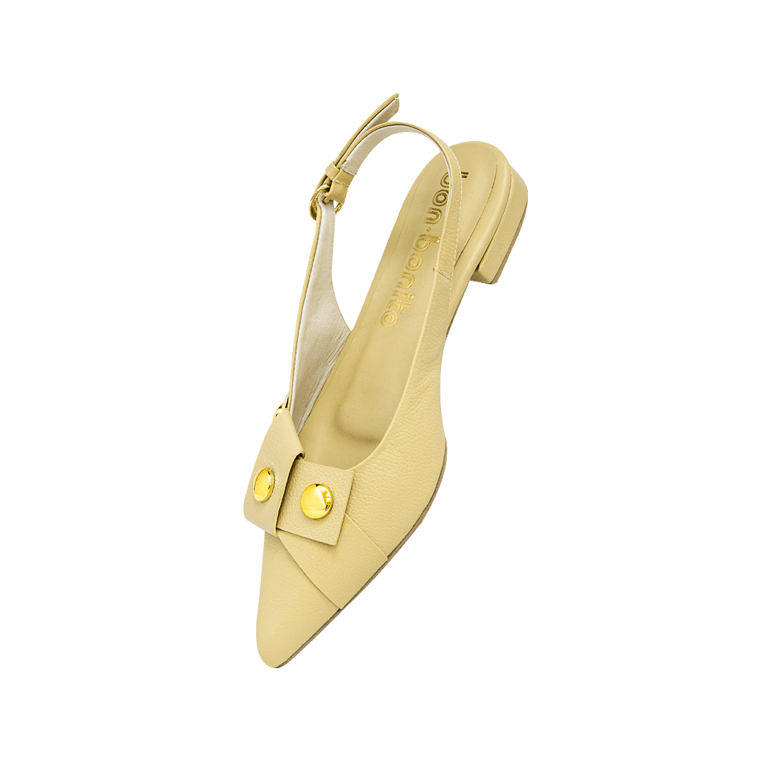 ¡Dale estilo y comodidad a tu caminar! • Baleta para mujer con taches decorativos en cuero granito color mantequilla • Acabado en punta • Hebilla lateral para mejor ajuste • Mini tacón forrado en cuero • Hecho a mano en Colombia.