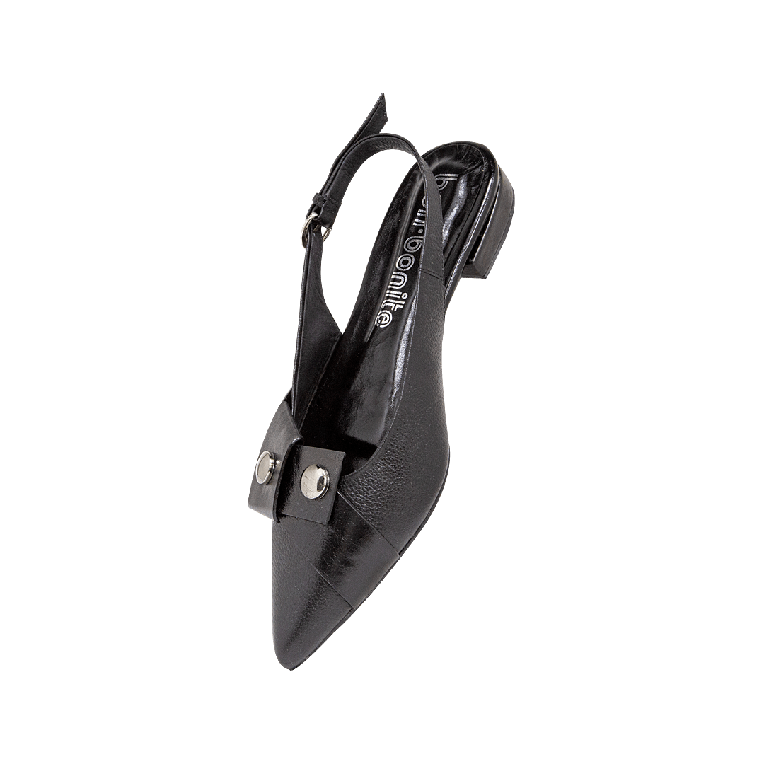 ¡Dale estilo y comodidad a tu caminar! • Baleta para mujer con taches decorativos en cuero granito color negro ónix • Acabado en punta • Hebilla lateral para mejor ajuste • Mini tacón forrado en cuero • Hecho a mano en Colombia.