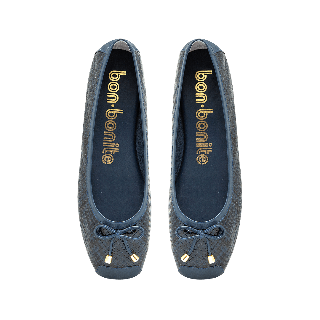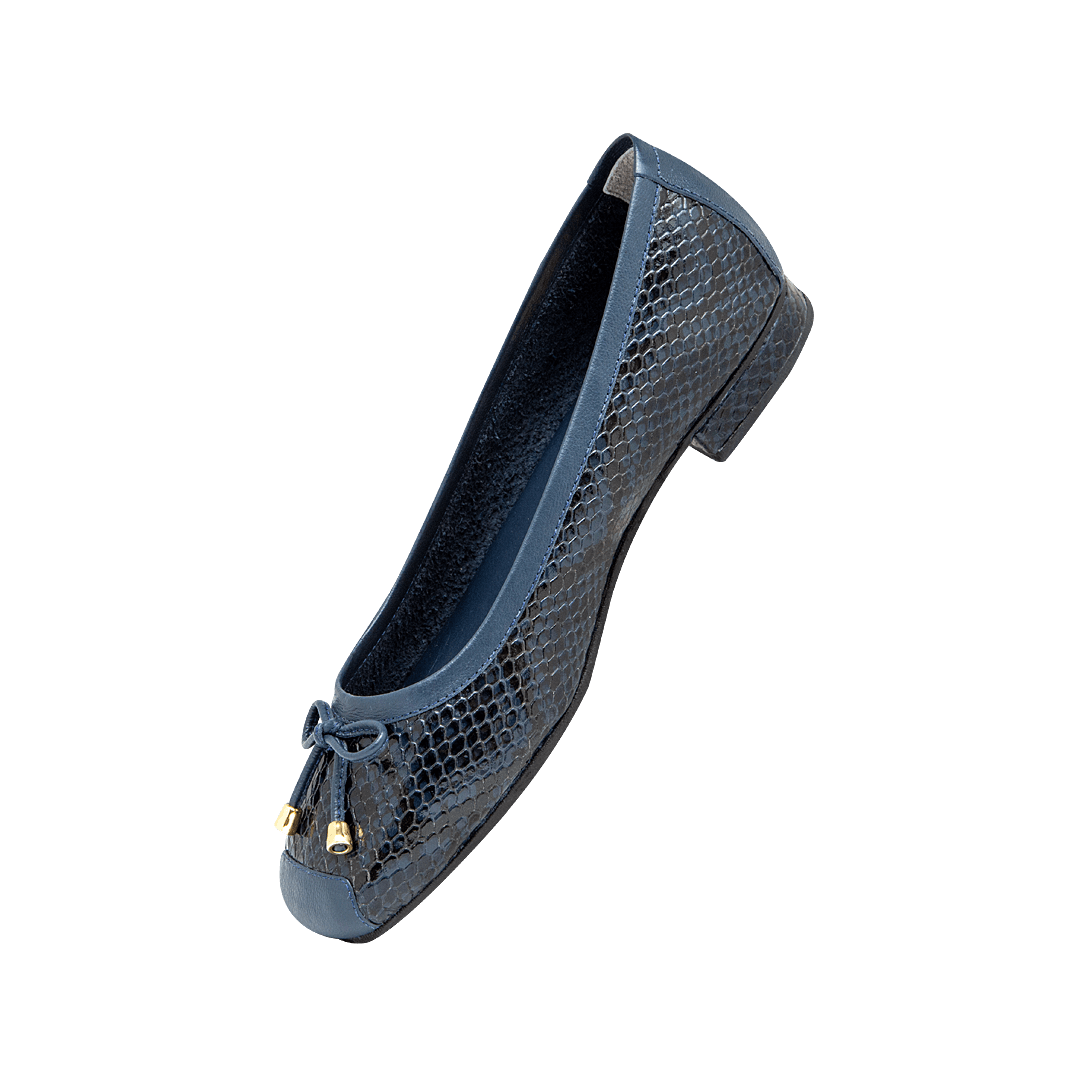 ¡Versátil y moderno! • Baleta para mujer en cuero grabado y liso color azul profundo • Moño decorativo en la capellada • Acabado en punta cuadrada • Mini tacón forrado en cuero • Hecho a mano en Colombia.