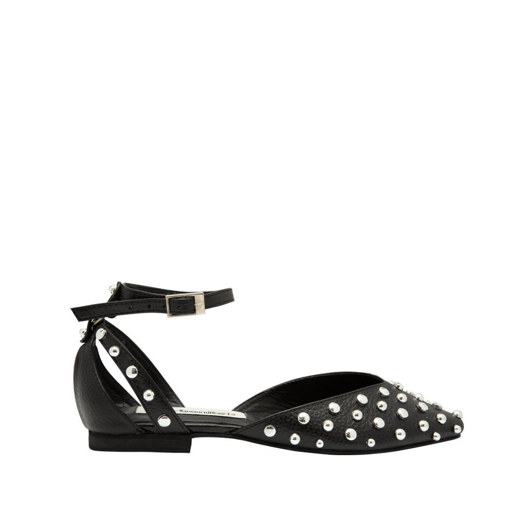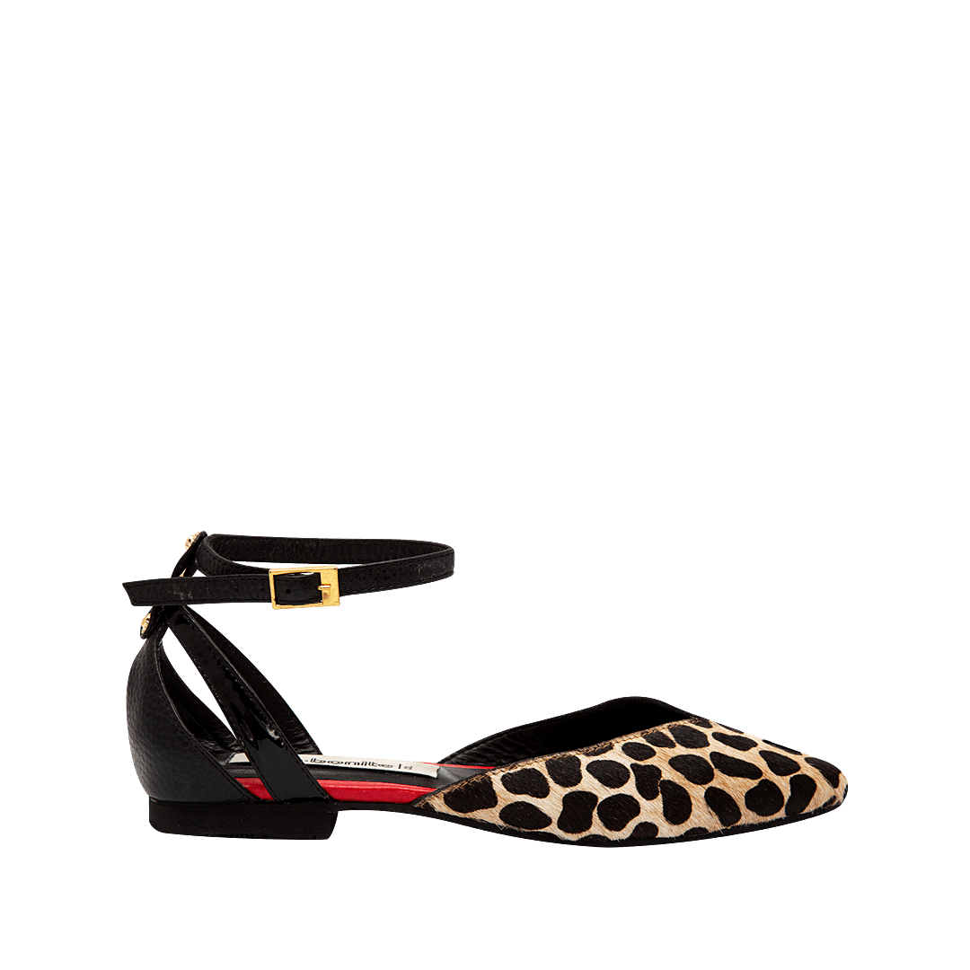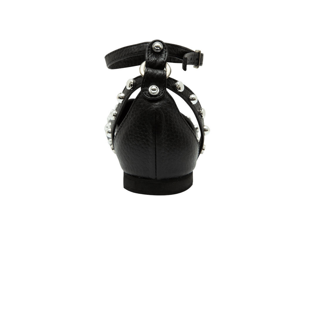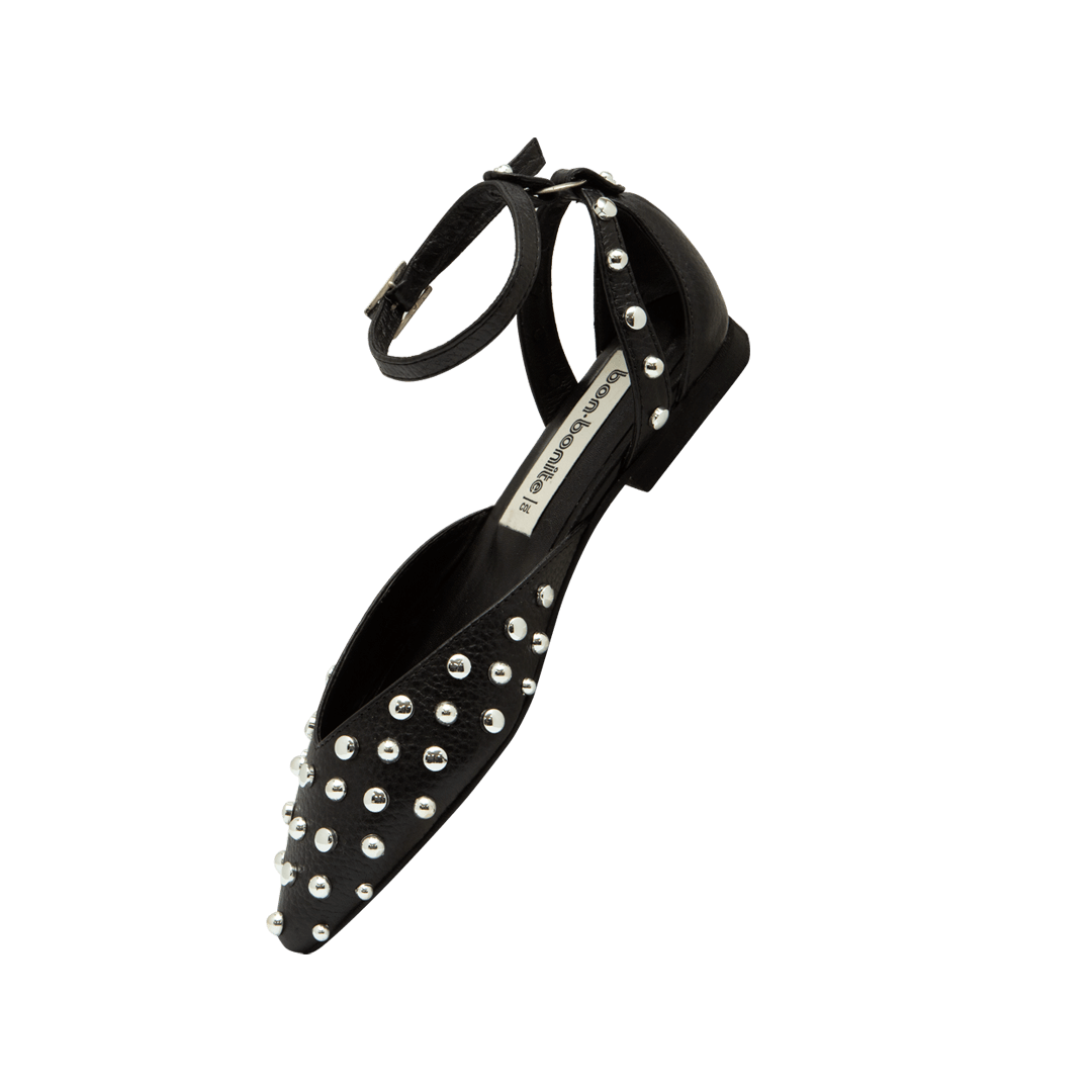 ¡Dale vida a tu look! • Baleta en cuero granito color negro ónix • Capellada con taches decorativos •Acabado en punta • Hebilla lateral en pulsera con amarre al tobillo • Forro en piel • Tacón de 1 cm • Suela en caucho • Hecho a mano en Colombia.