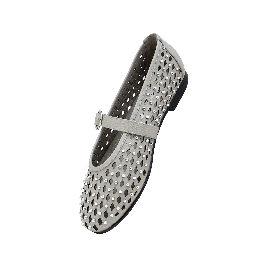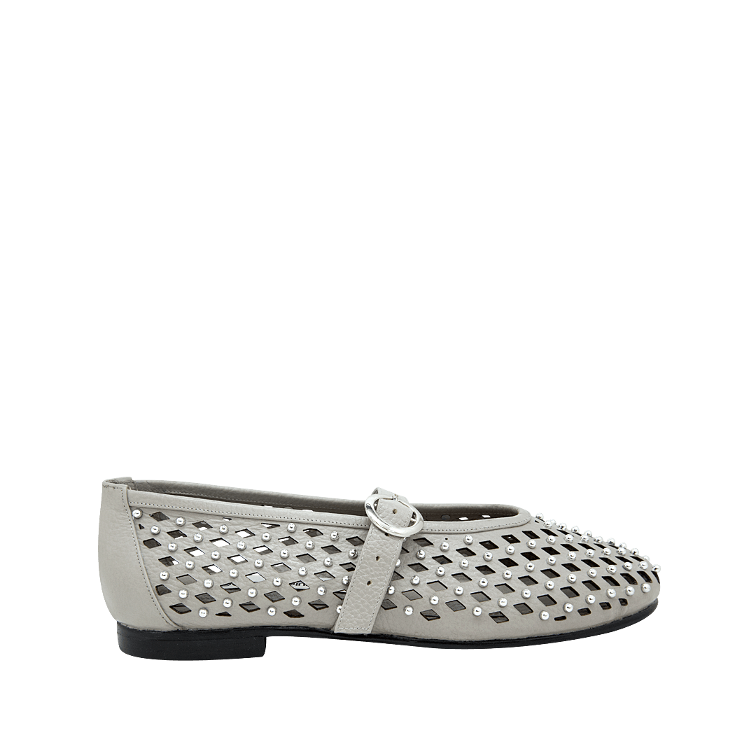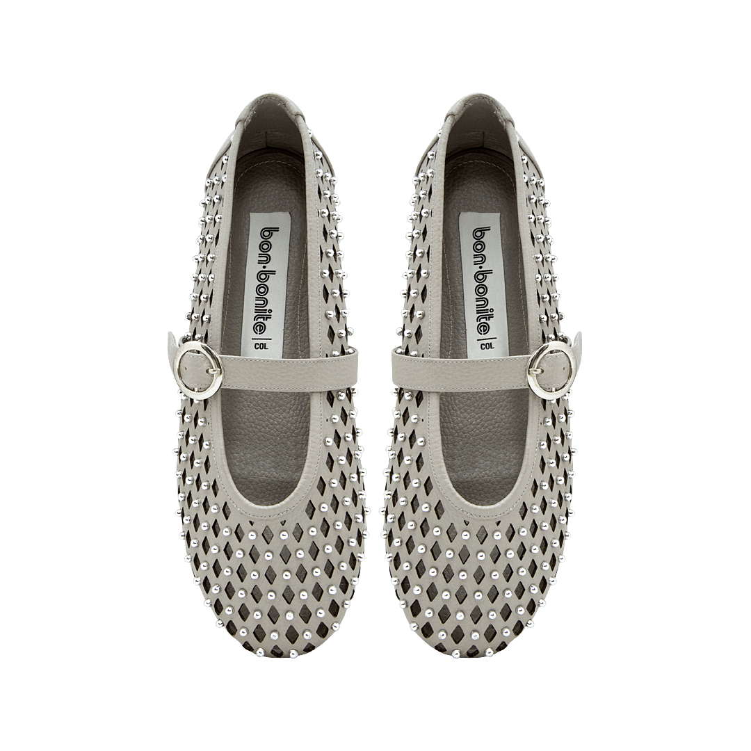 ¡Atrévete a lucir diferente! • Baleta para mujer en cuero perforado color ceniza con taches decorativos • Acabado en punta redonda • Hebilla lateral para mejor ajuste • Mini tacón en madera • Hecho a mano en Colombia.