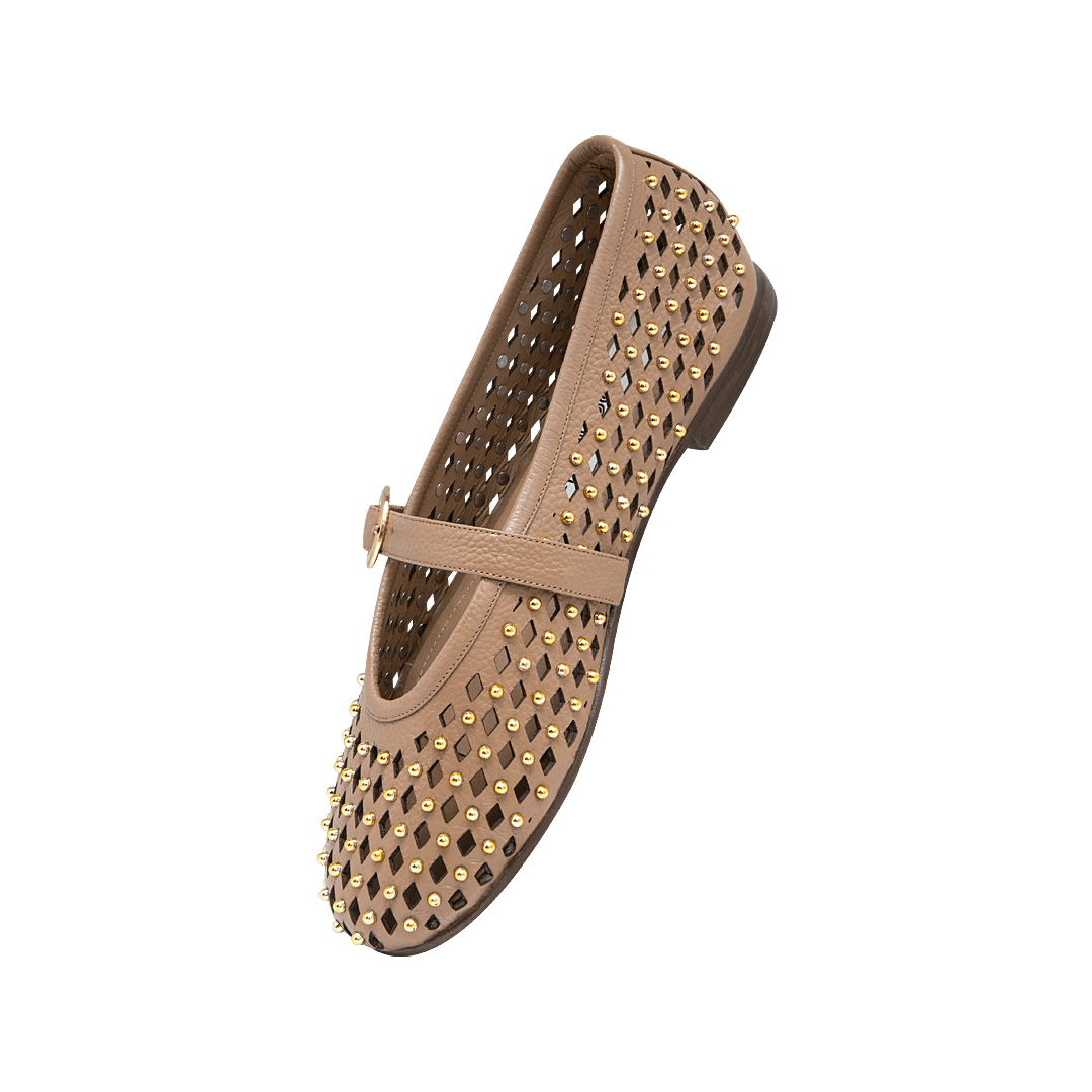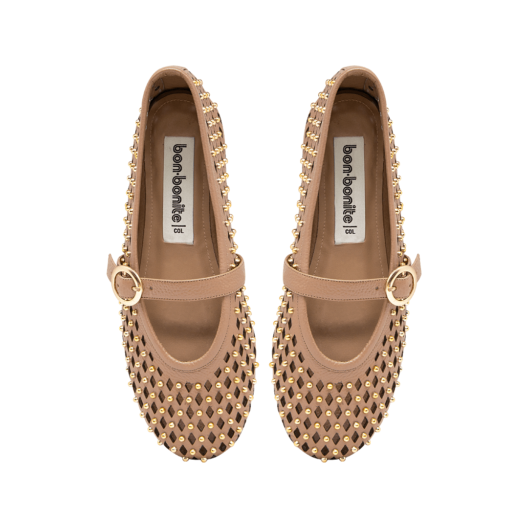 ¡Atrévete a lucir diferente! • Baleta para mujer en cuero perforado color moca con taches decorativos • Acabado en punta redonda • Hebilla lateral para mejor ajuste • Mini tacón en madera • Hecho a mano en Colombia.