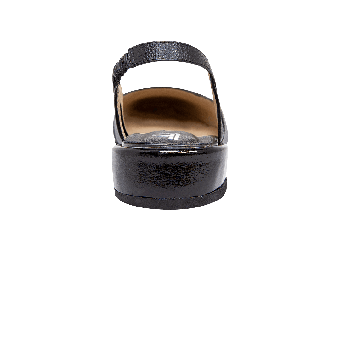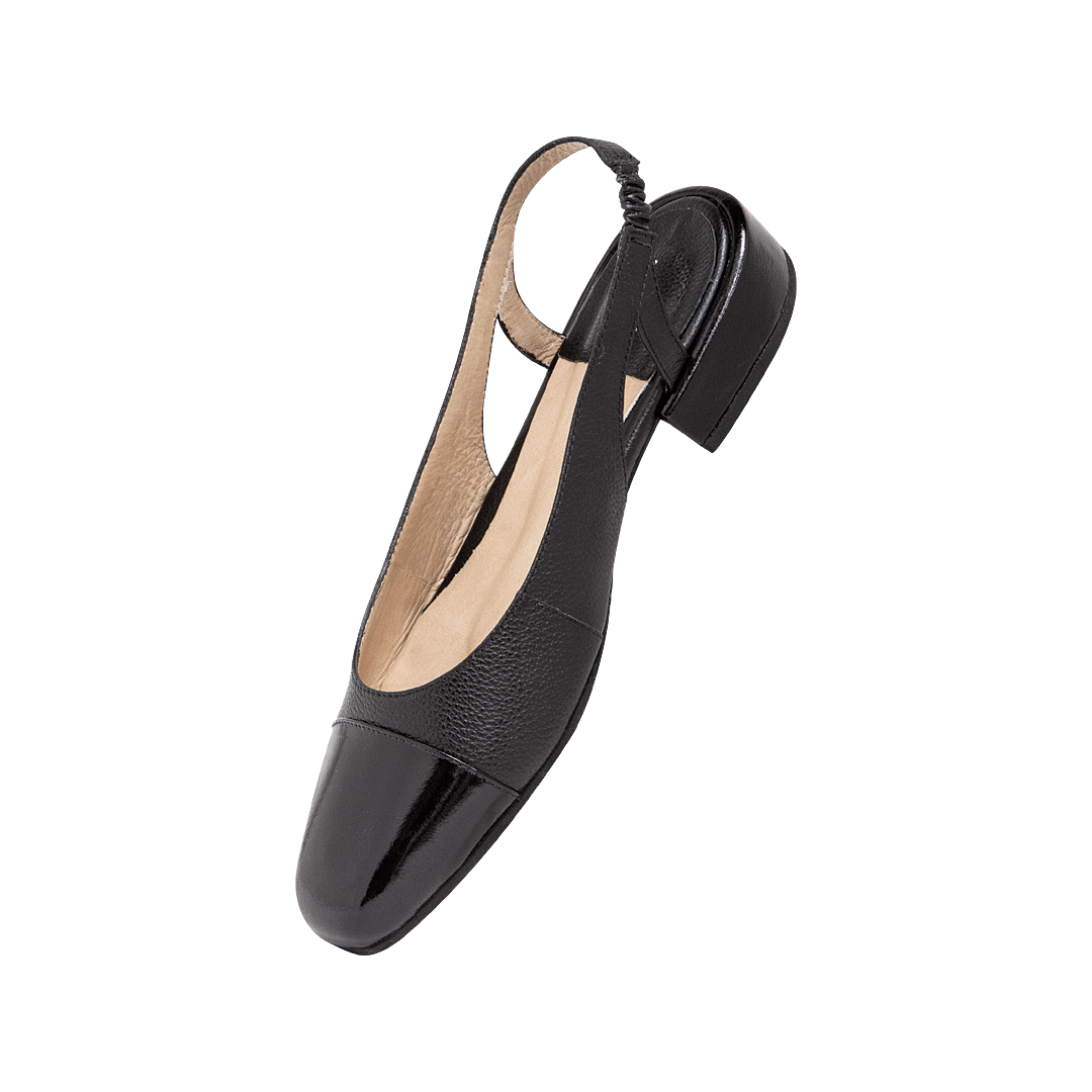 ¡Sutil y cómoda! • Baleta para mujer en cuero granito y liso color negro ónix • Acabado en punta cuadrada • Resorte lateral para mejor ajuste • Tacón forrado en cuero • Hecho a mano en Colombia.