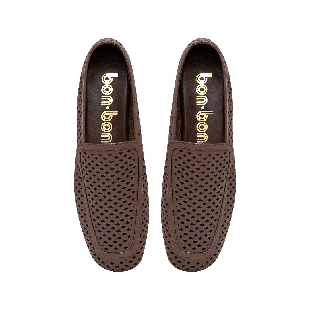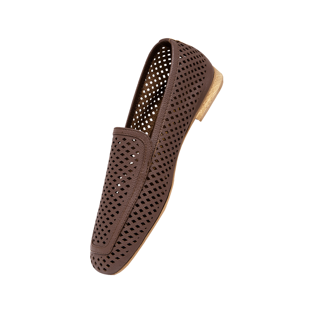 ¡Haz que cada paso se sienta especial! • Mocasín para mujer en cuero perforado con láser color cacao • Acabado en punta cuadrada • Mini tacón en madera • Hecho a mano en Colombia.