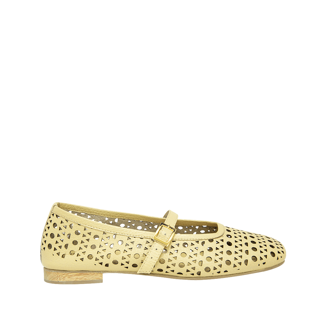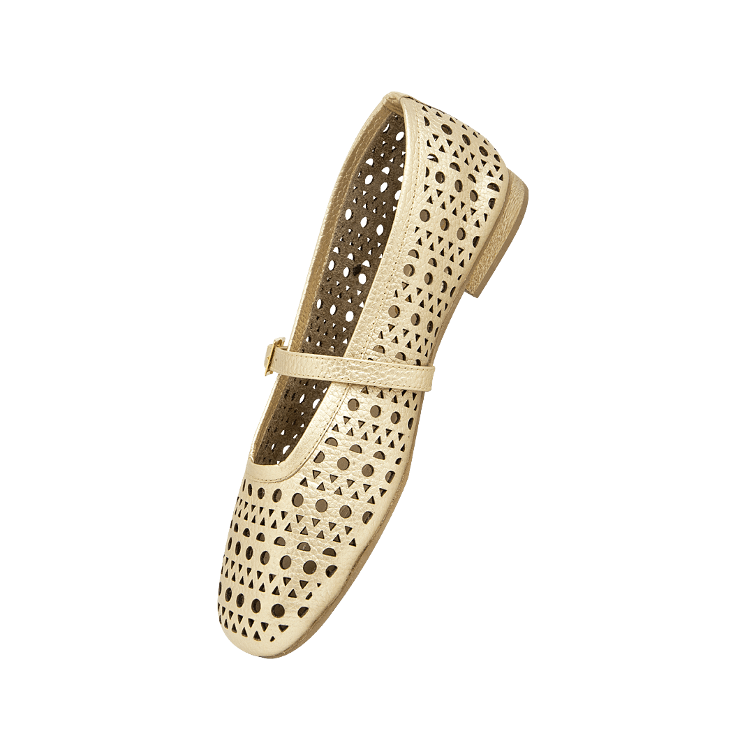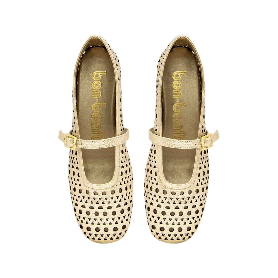 ¡Suaves y delicadas! • Baleta para mujer en cuero perforado color oro nuevo • Acabado en punta cuadrada • Hebilla lateral para mejor ajuste • Mini tacón en madera • Hecho a mano en Colombia.