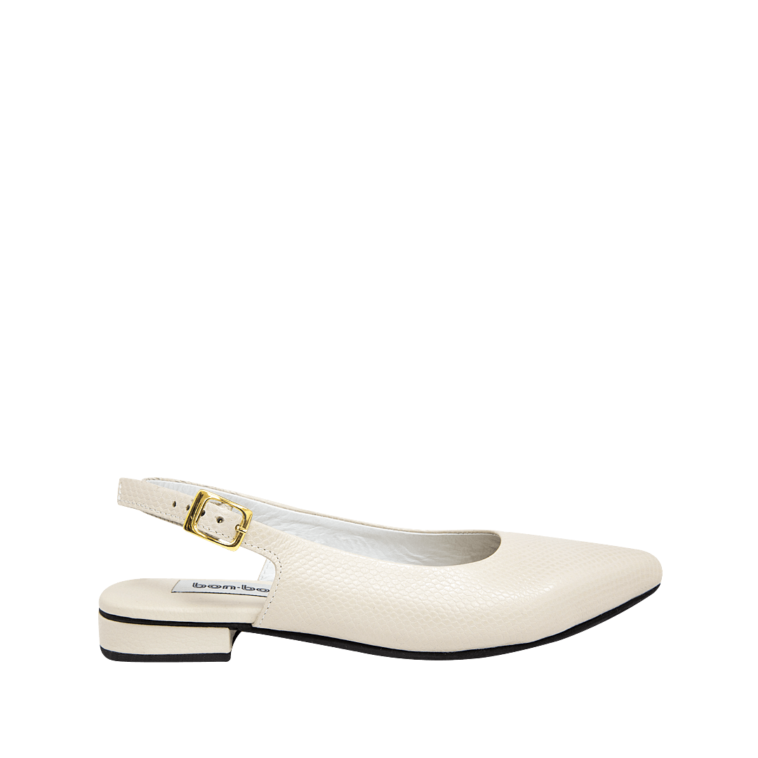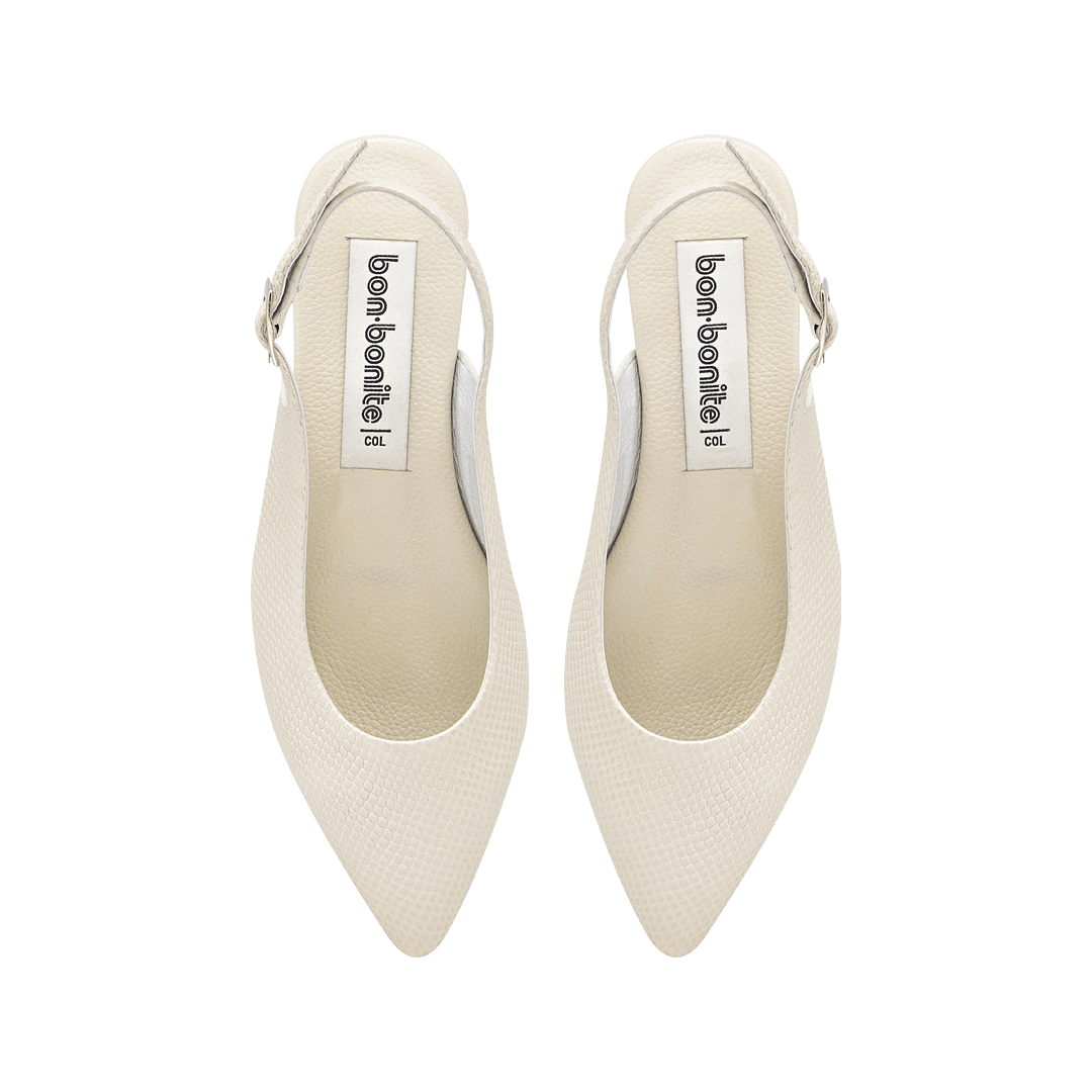 ¡Sutileza que la hace irresistible! • Baleta para mujer en cuero grabado color talco • Acabado en punta • Hebilla lateral para mejor ajuste • Mini tacón forrado en cuero • Hecho a mano en Colombia.