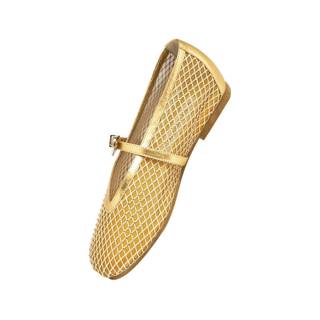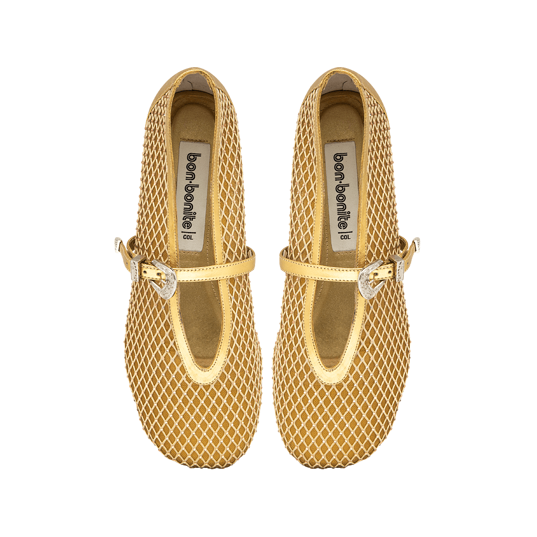 ¡El toque de magia que transforma cualquier look! • Baleta para mujer en textil color oro nuevo • Capellada en malla con piedras de fantasía y vivo en cuero • Acabado en punta semi redonda • Hebilla lateral para mejor ajuste • Mini tacón en caucho • Hecho a mano en Colombia.