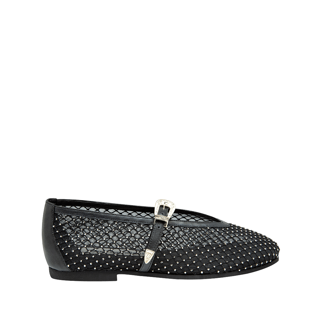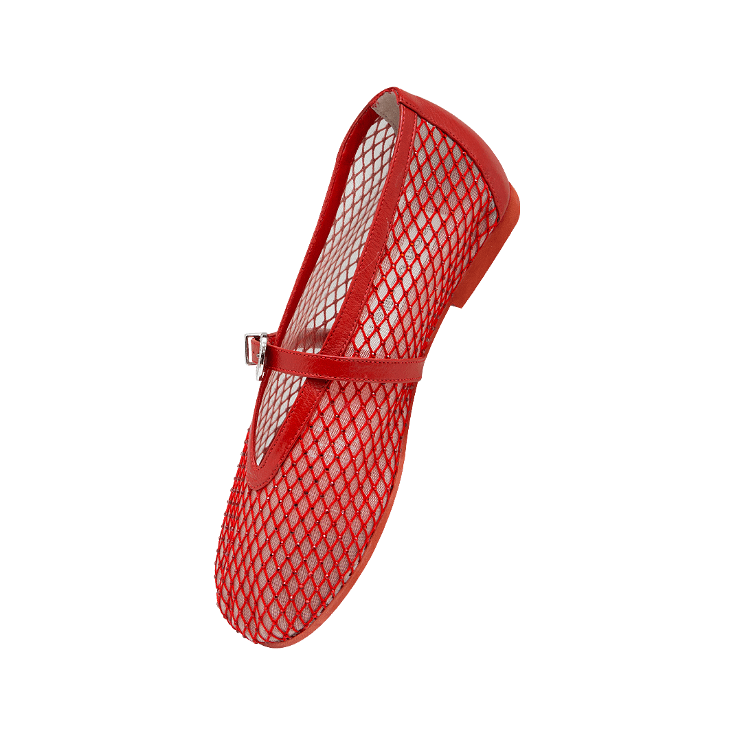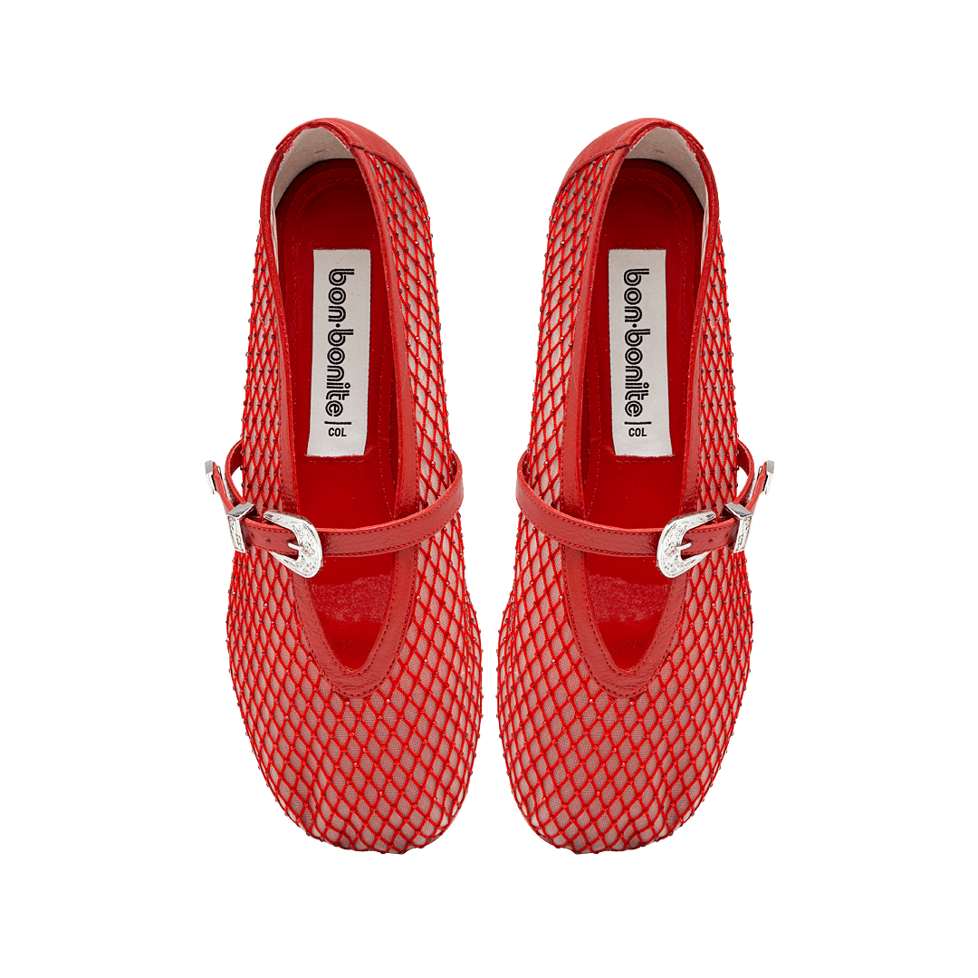 ¡El toque de magia que transforma cualquier look! • Baleta para mujer en textil color rojo escarlata • Capellada en malla con piedras de fantasía y vivo en cuero • Acabado en punta semi redonda • Hebilla lateral para mejor ajuste • Mini tacón en caucho • Hecho a mano en Colombia.
