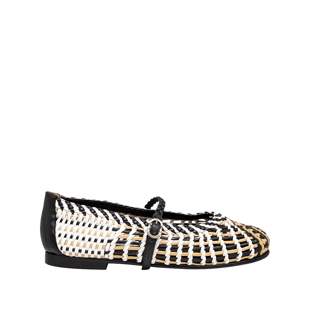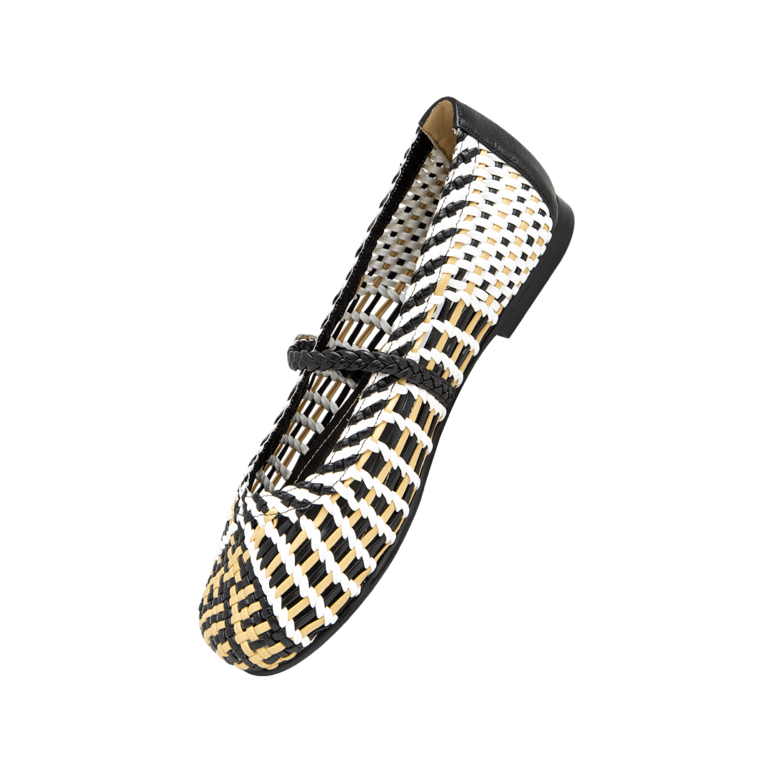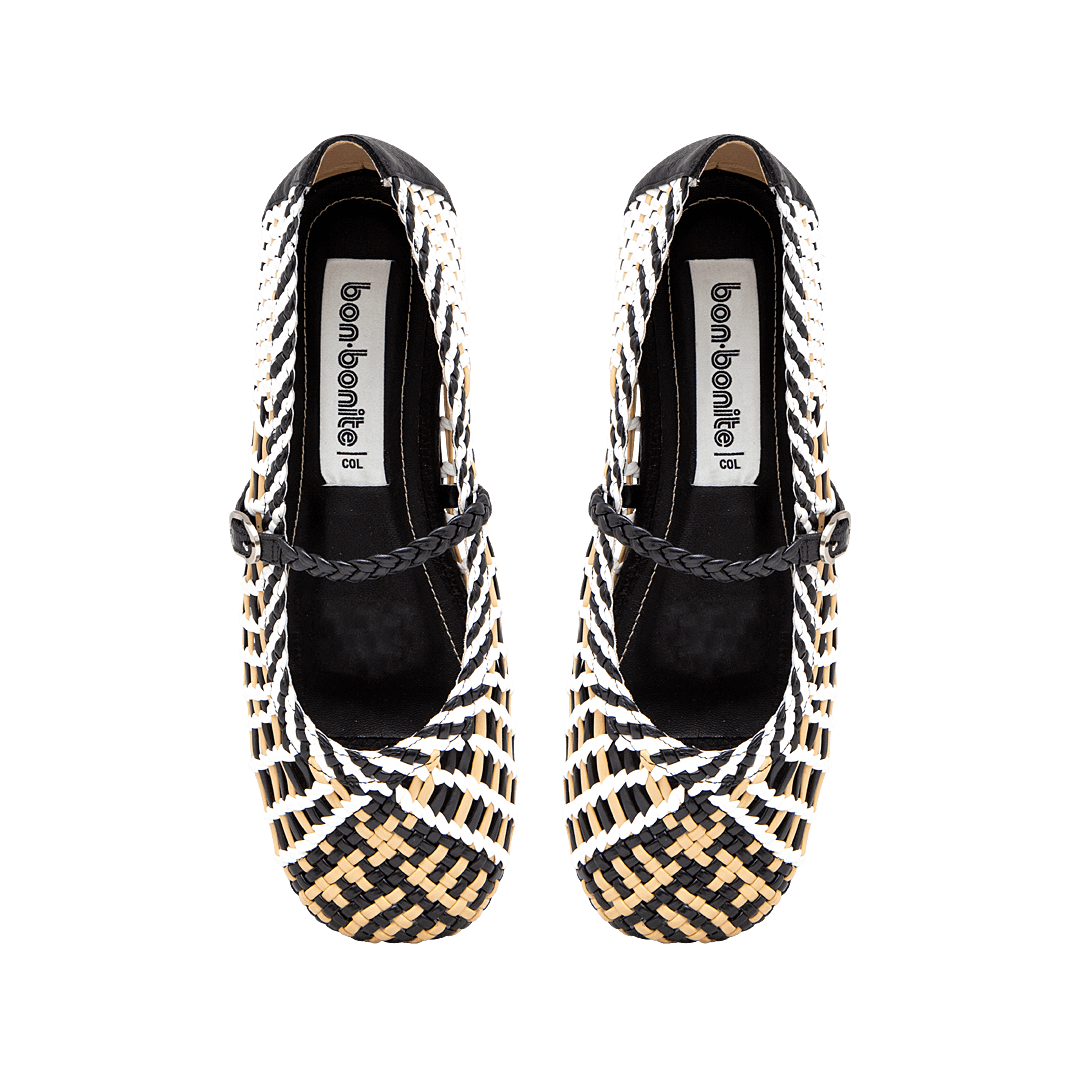 ¡El detalle más sofisticado de tu outfit! • Baleta para mujer tejida color talco por negro ónix y camel • Hebilla lateral para mejor ajuste • Acabado en punta cuadrada • Hecho a mano en Colombia.