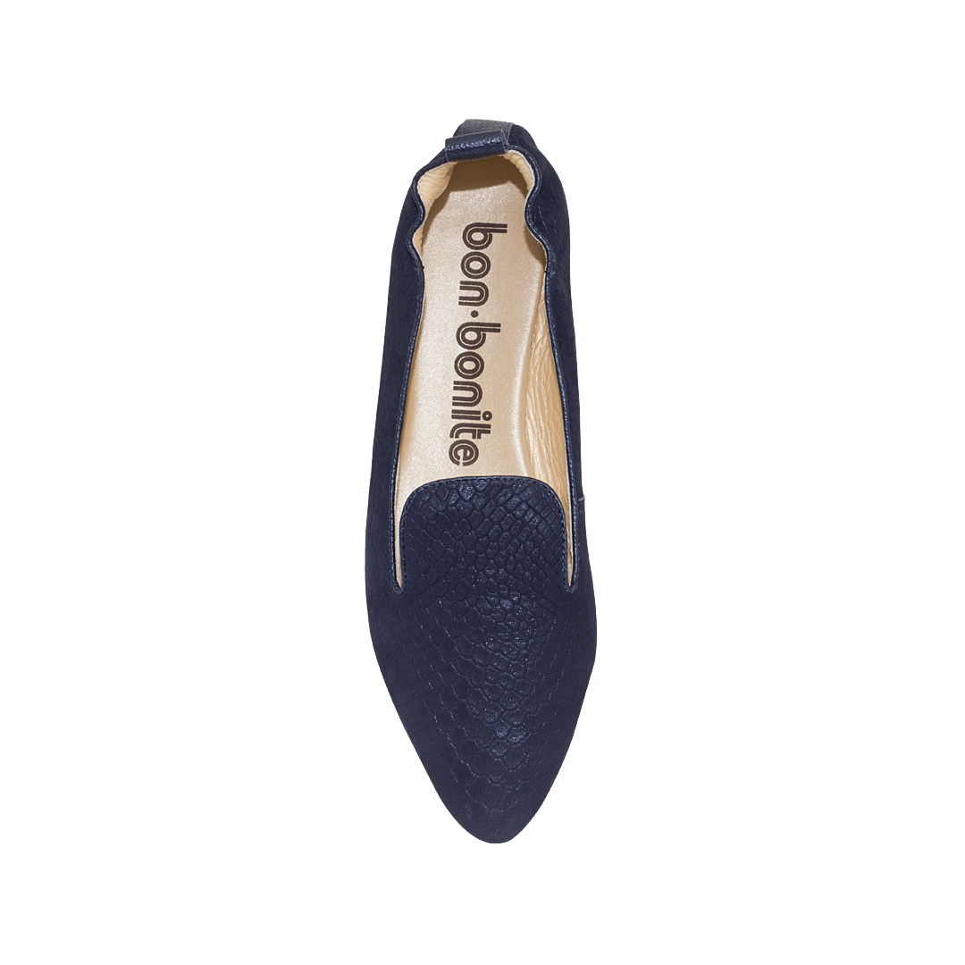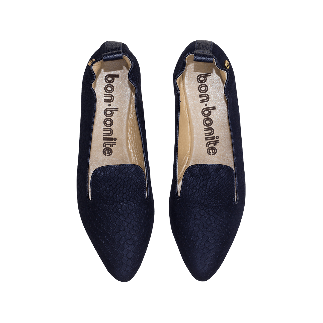¡Perfectas para un look básico! • Baleta para mujer en cuero grabado color azul noche • Acabado en punta • Mini resorte trasero para un mejor ajuste • Hecho a mano en Colombia.