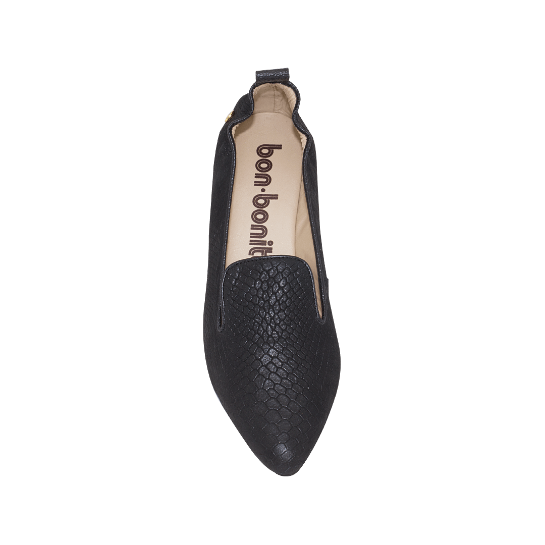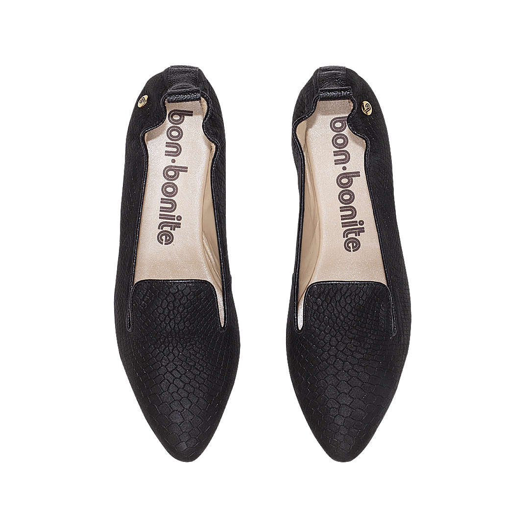 ¡Perfectas para un look básico! • Baleta para mujer en cuero grabado color negro ónix • Acabado en punta • Mini resorte trasero para un mejor ajuste • Hecho a mano en Colombia.