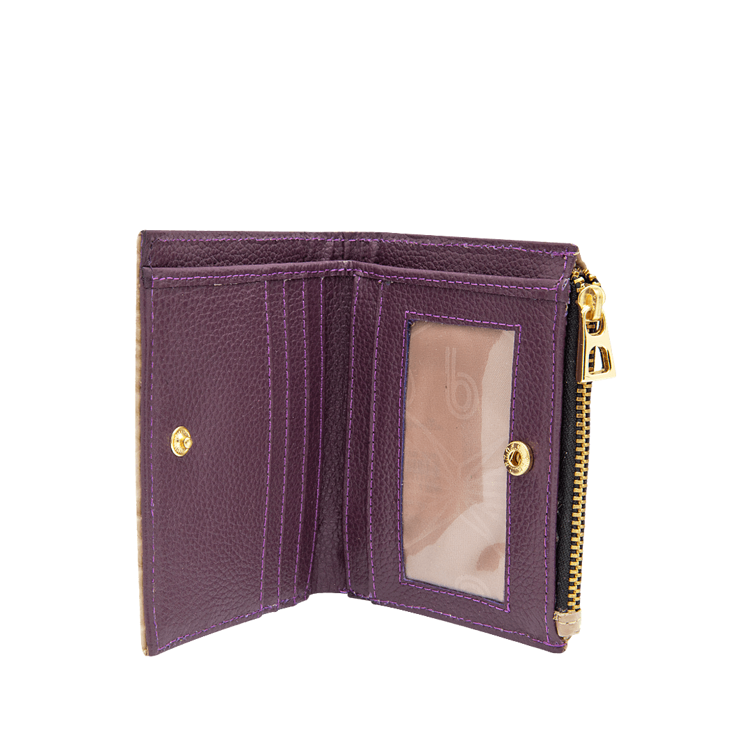 ¡Frescura y autenticidad! • Billetera para mujer en cuero grabado color taupe por berenjena • Compartimiento para billetes • Bolsillo con cierre mediante cremallera para monedas • Seis compartimientos para tarjetas • Hecho a mano en Colombia.