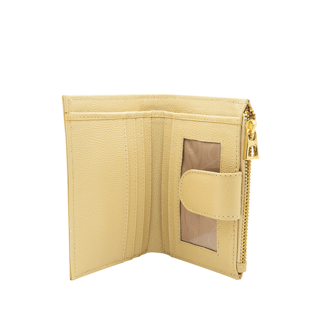 ¡Ideal para mujeres modernas! • Billetera para mujer en cuero granito color mantequilla • Cierre mediante pin • Compartimiento para billetes • Bolsillo con cierre mediante cremallera para monedas • Bolsillo frontal • Seis compartimientos para tarjetas • Hecho a mano en Colombia.