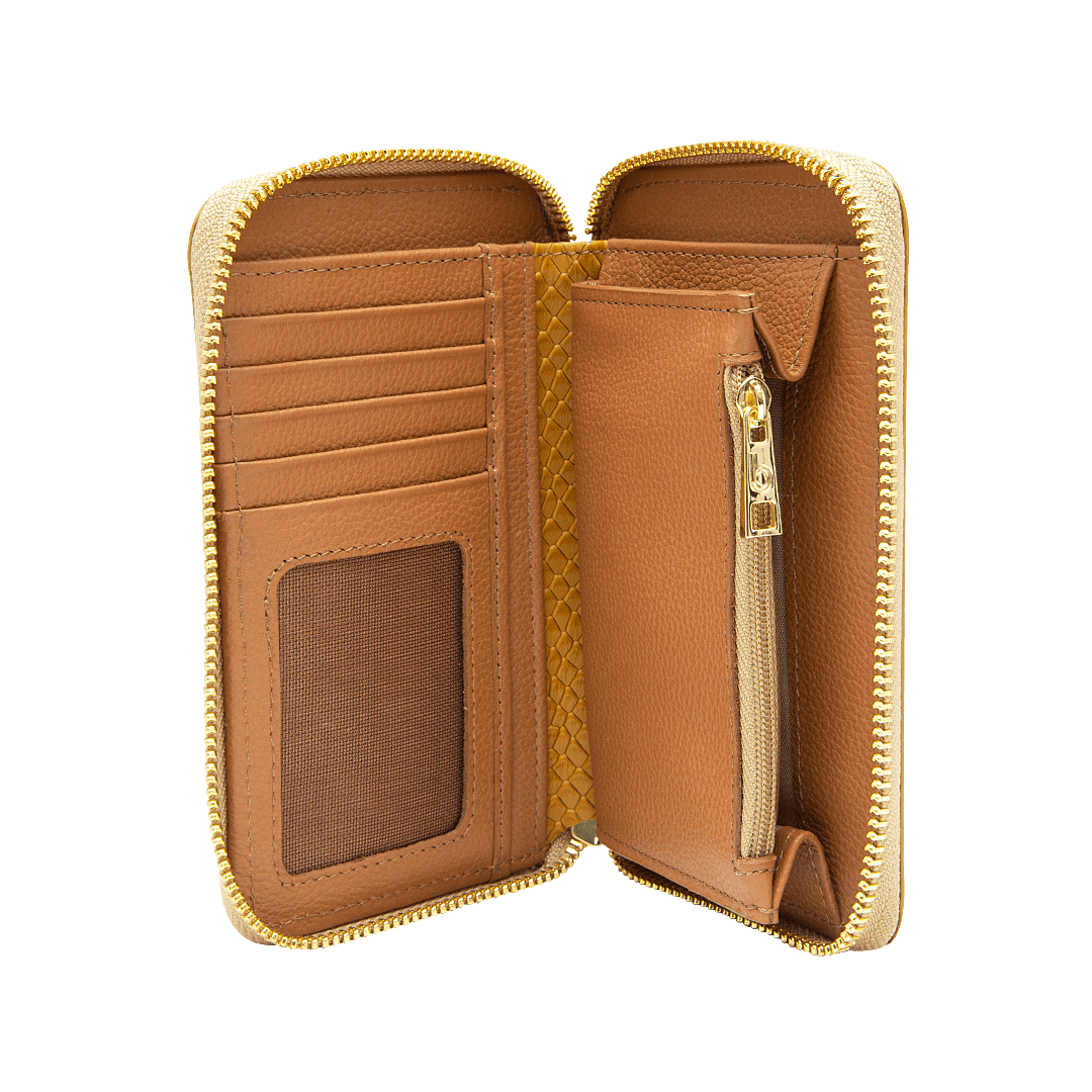 ¡Practicidad y estilo! • Billetera para mujer en cuero grabado color pardo por oro • Compartimiento para billetes • Bolsillo con cierre mediante cremallera para monedas • Ocho compartimientos para tarjetas • Hecho a mano en Colombia.