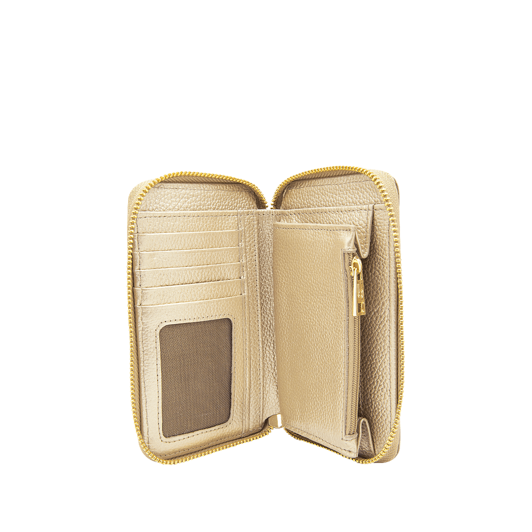 ¡Practicidad y estilo! • Billetera para mujer en cuero grabado color pardo por oro • Compartimiento para billetes • Bolsillo con cierre mediante cremallera para monedas • Ocho compartimientos para tarjetas • Hecho a mano en Colombia.