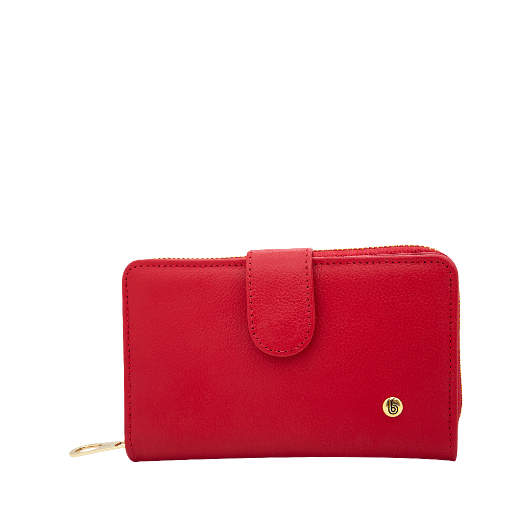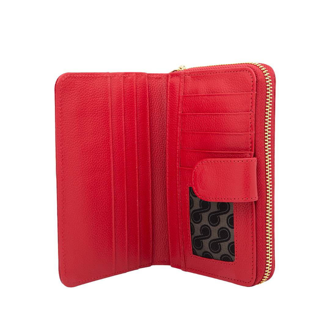 ¡Estilo elegante y funcional! • Billetera para mujer en cuero granito color rojo achiote • Cierre mediante pin • Once compartimientos para tarjetas • Bolsillo con cierre mediante cremallera con seis compartimientos • Bolsillo interno con cierre mediante cremallera para monedas • Hecho a mano en Colombia.