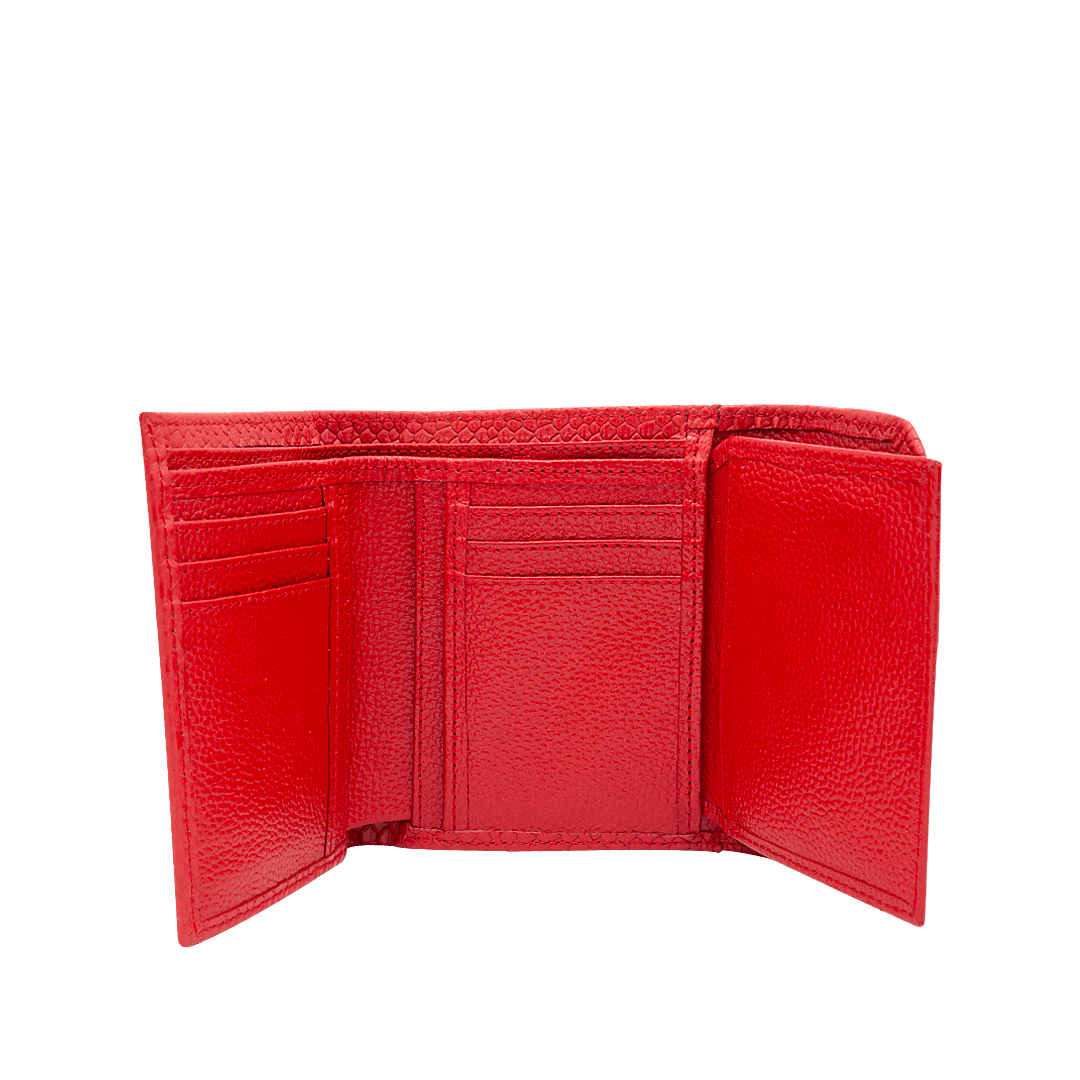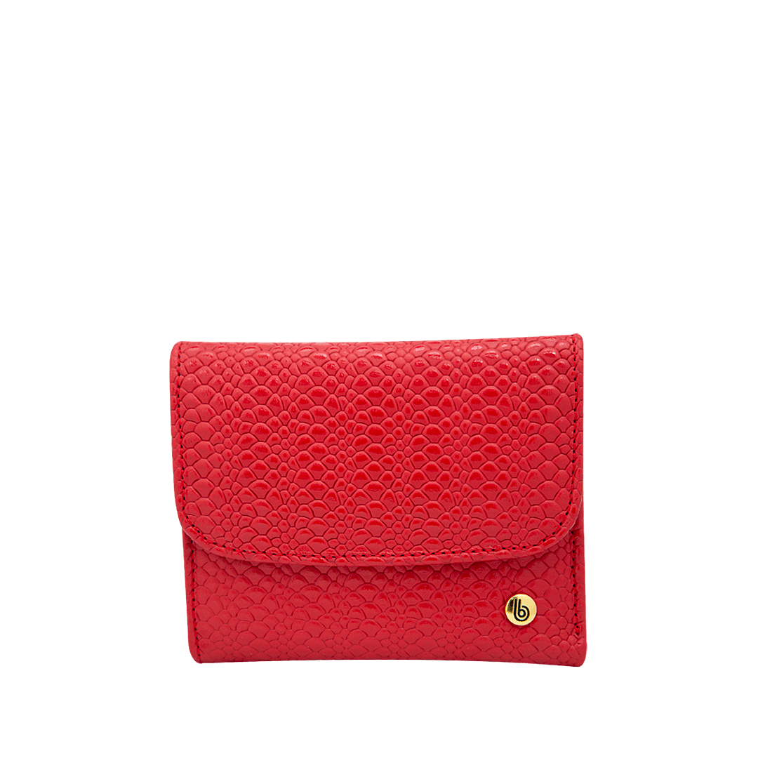 ¡Un toque de distinción! • Billetera para mujer en cuero grabado y granito color rojo achiote • Cierre mediante pin • Doble compartimiento para billetes • Bolsillo trasero con cierre mediante pin • Quince compartimientos para tarjetas • Hecho a mano en Colombia.