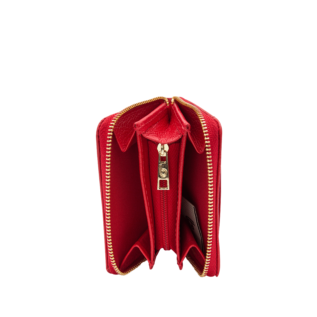¡Lleva contigo lo esencial! • Billetera para mujer en cuero grabado color rojo achiote • Cierre mediante cremallera • Dos compartimientos internos • Bolsillo para monedas con cremallera • Tres compartimientos para tarjetas • Hecho a mano en Colombia.