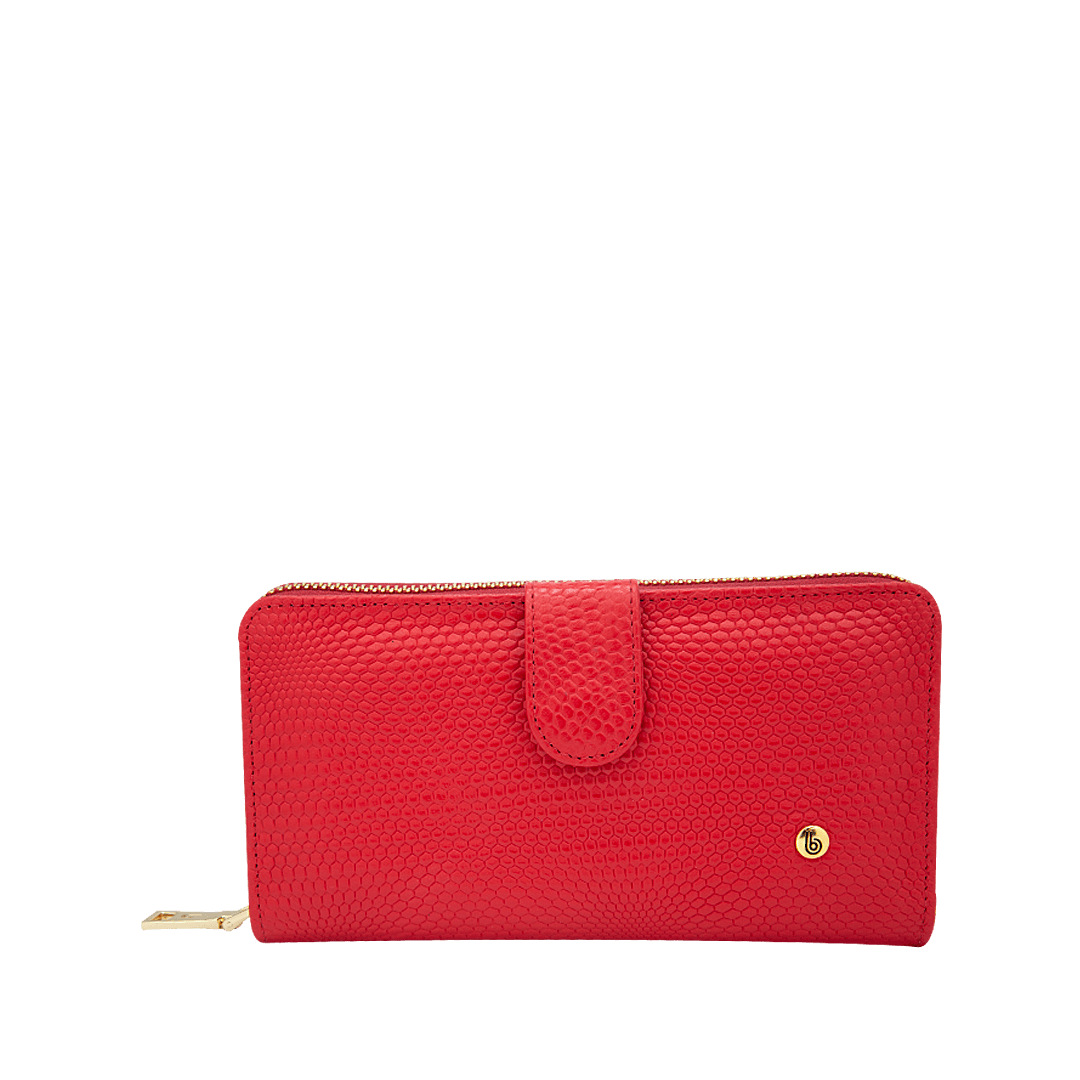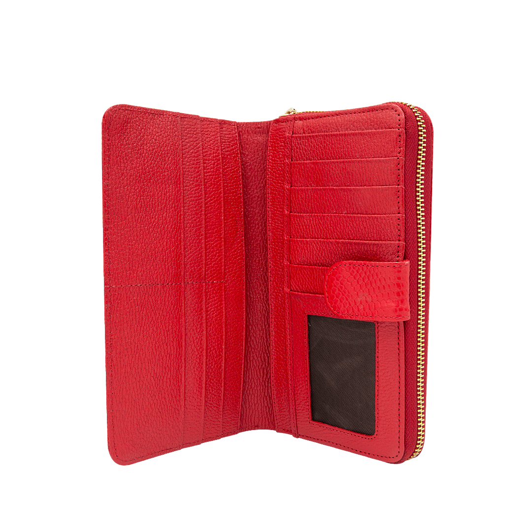 ¡El accesorio perfecto para mujeres dinámicas! • Billetera para mujer en cuero grabado color rojo achiote • Cierre mediante pin • Dieciséis compartimientos para tarjetas • Bolsillo con cierre mediante cremallera con 10 compartimientos • Bolsillo interno con cierre mediante cremallera para monedas • Hecho a mano en Colombia.