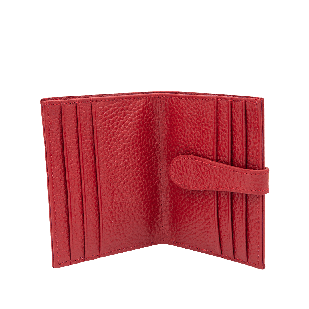 ¡Un accesorio que habla por ti! • Billetera para mujer en cuero granito rojo escarlata • Cierre mediante pin • Compartimiento para billetes • Nueve compartimientos para tarjetas • Hecho a mano en Colombia.