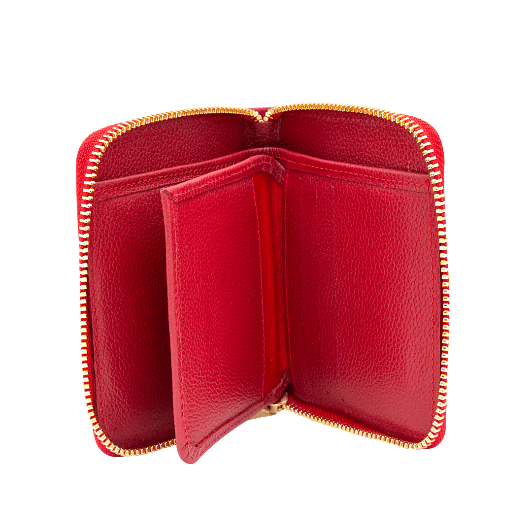¡Elegante y funcional! • Billetera para mujer en cuero granito color rojo escarlata • Cierre mediante cremallera • Compartimiento para billetes • Bolsillo trasero con cierre mediante cremallera para monedas • Once compartimientos para tarjetas • Hecho a mano en Colombia.