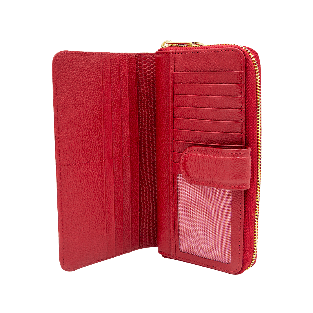 ¡Elegancia que se nota en cada detalle! • Billetera para mujer en cuero grabado y granito color rojo escarlata • Cierre mediante pin • Compartimiento frontal • Diecinueve compartimientos para tarjetas • Bolsillo con cierre mediante cremallera con Diez compartimientos • Bolsillo interno con cierre mediante cremallera para monedas • Hecho a mano en Colombia.