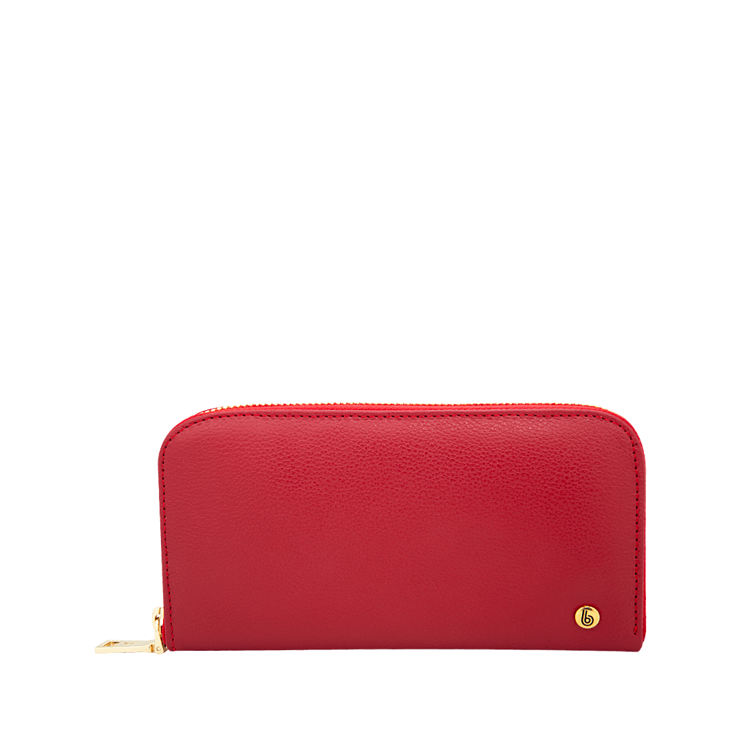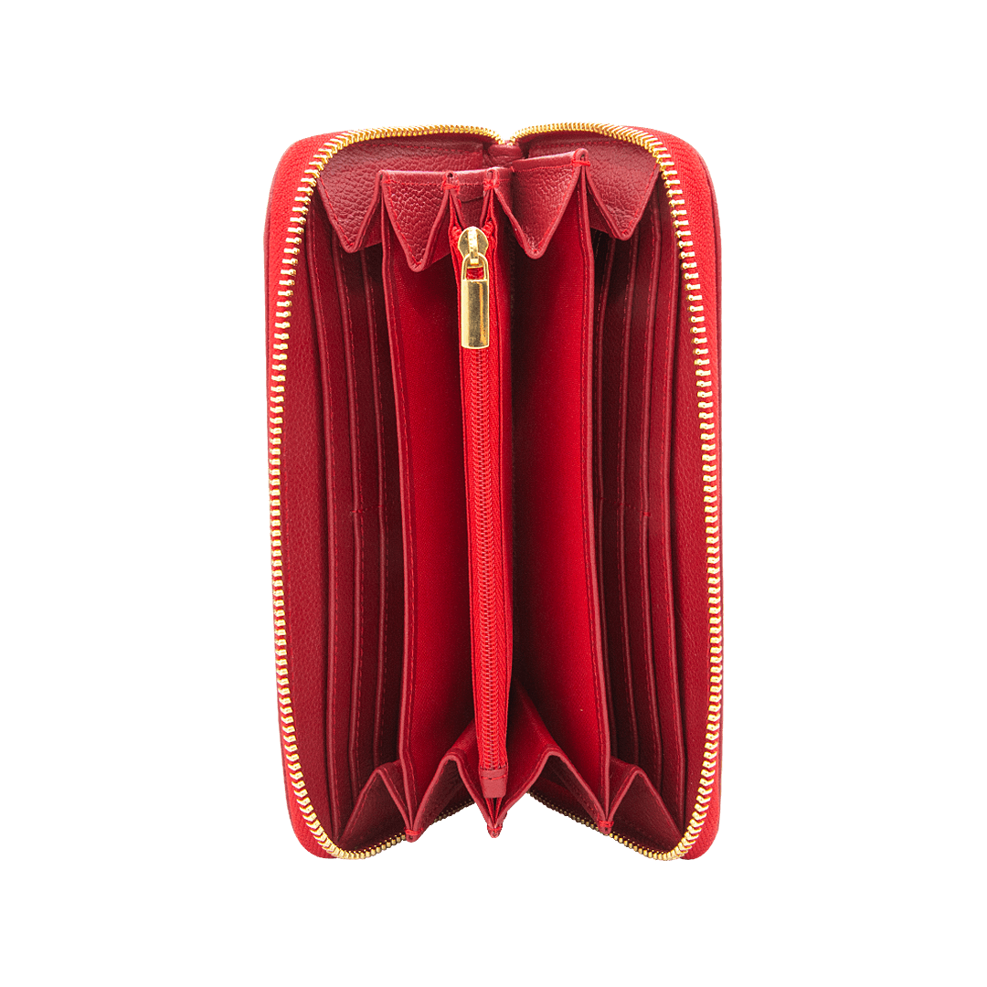 ¡Moderna y elegante! • Billetera para mujer en cuero granito color rojo escarlata • Doble compartimiento para billetes • Bolsillo con cierre mediante cremallera • Catorce compartimientos para tarjetas • Hecho a mano en Colombia.