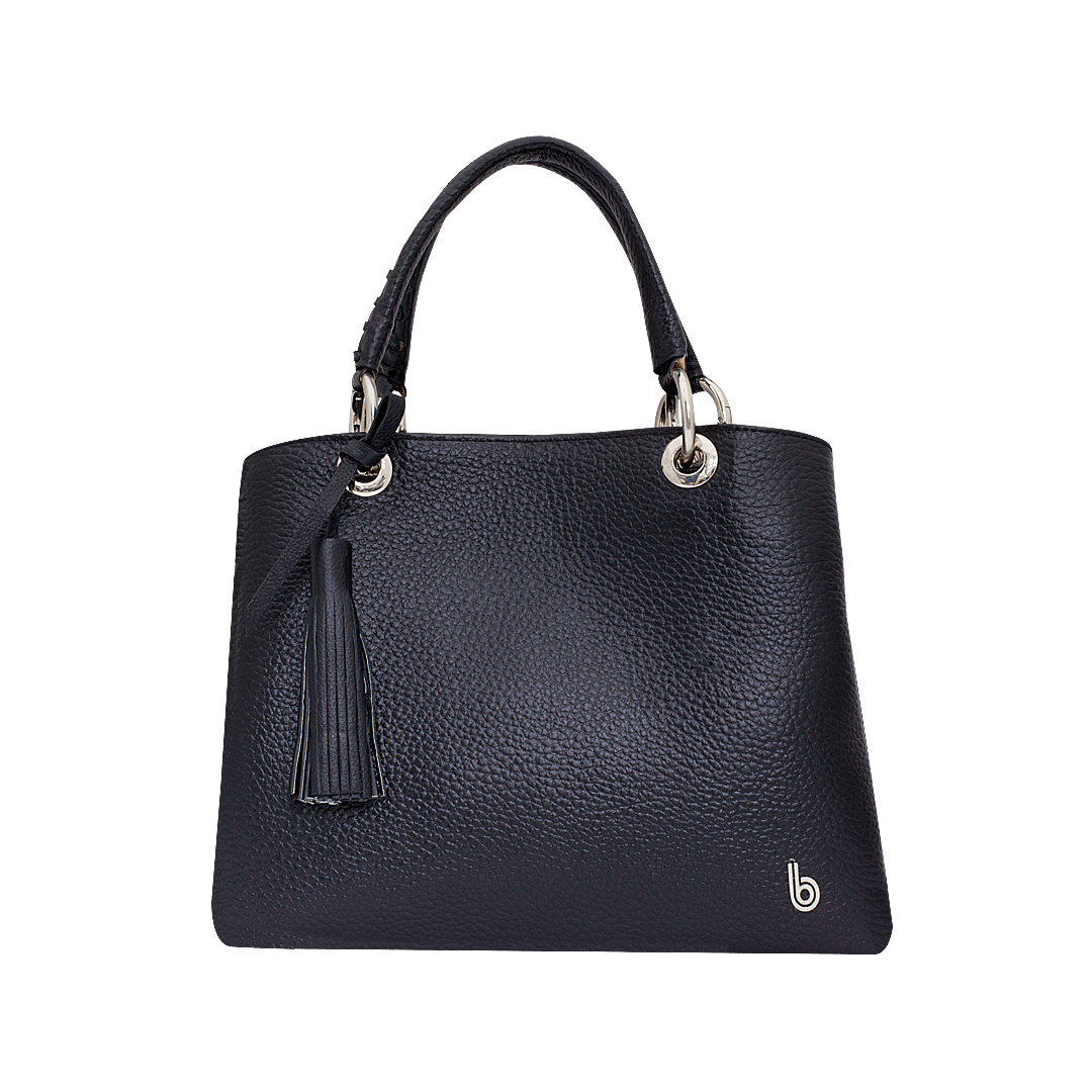 ¡Un infaltable! • Cartera en cuero color negro ónix • Forro en textil • Cierre mediante cremallera • Bolsillo auxiliar interno • Asa corta • Accesorio decorativo en flecos a tono • Placa con la letra «b» de nuestro logo • Hecho a mano en Colombia.