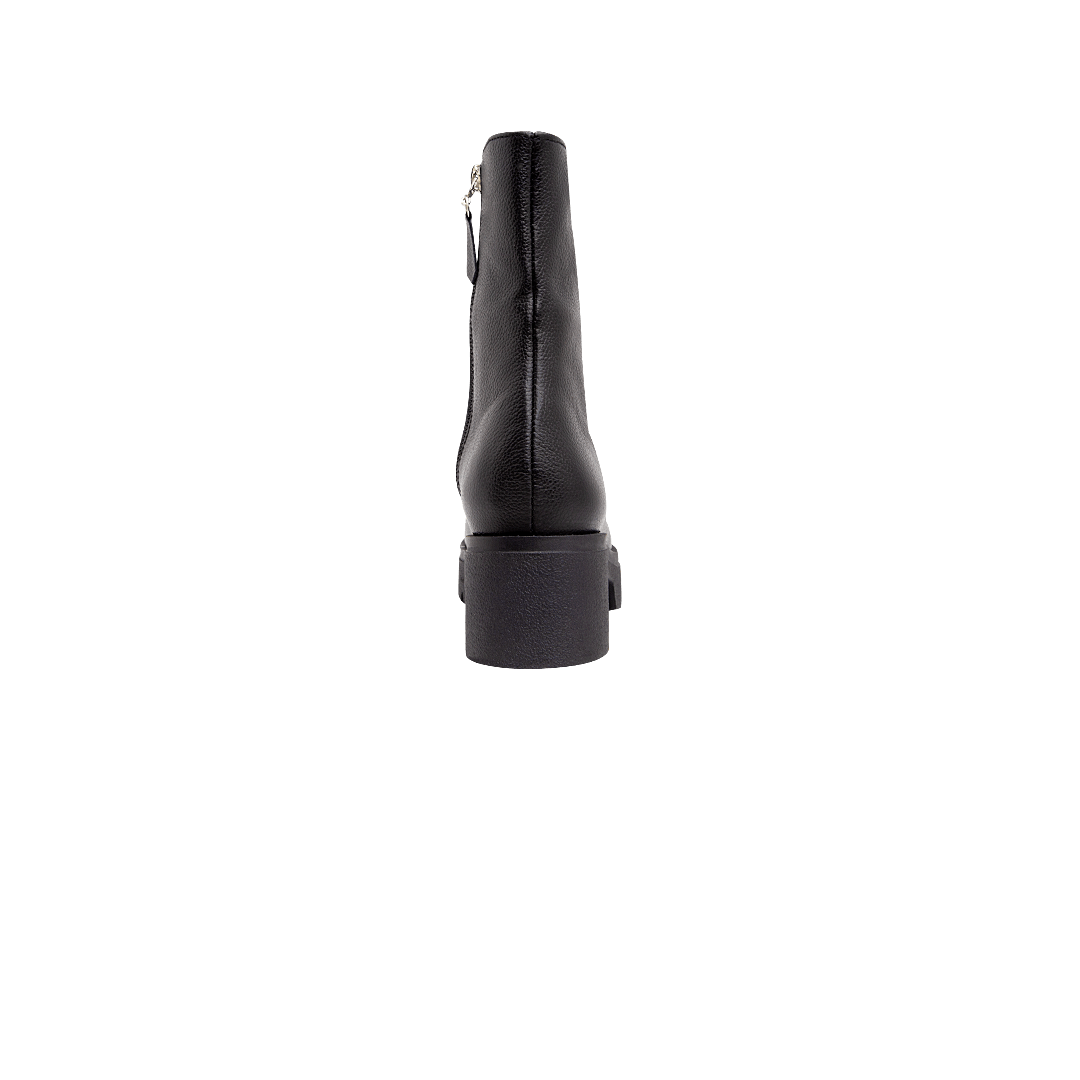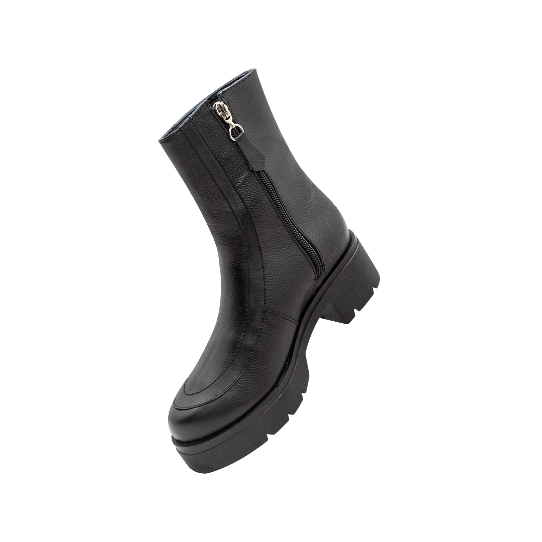 ¡Estilo a cada paso! • Bota para mujer en cuero color negro ónix • Acabado en punta ovalada • Cierre lateral con cremallera • Plataforma tractorada en caucho • Hecho a mano en Colombia.