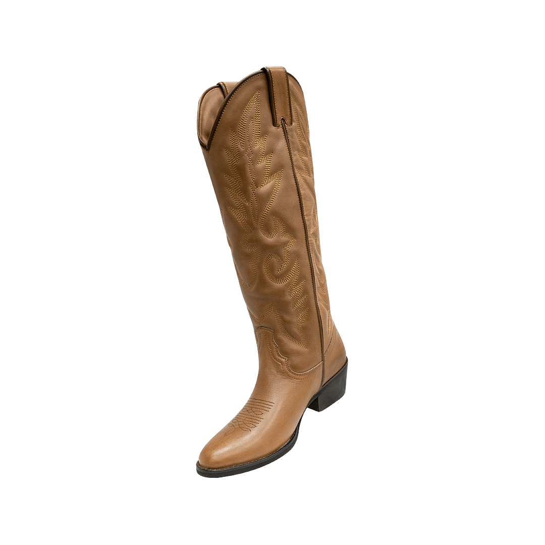 ¡Al mejor estilo tejano! • Bota texana para mujer en cuero color almendra • Acabado en punta • Bordados en la capellada • Tacón forrado en madera • Suela en caucho para mayor comodidad • Hecho en Colombia.