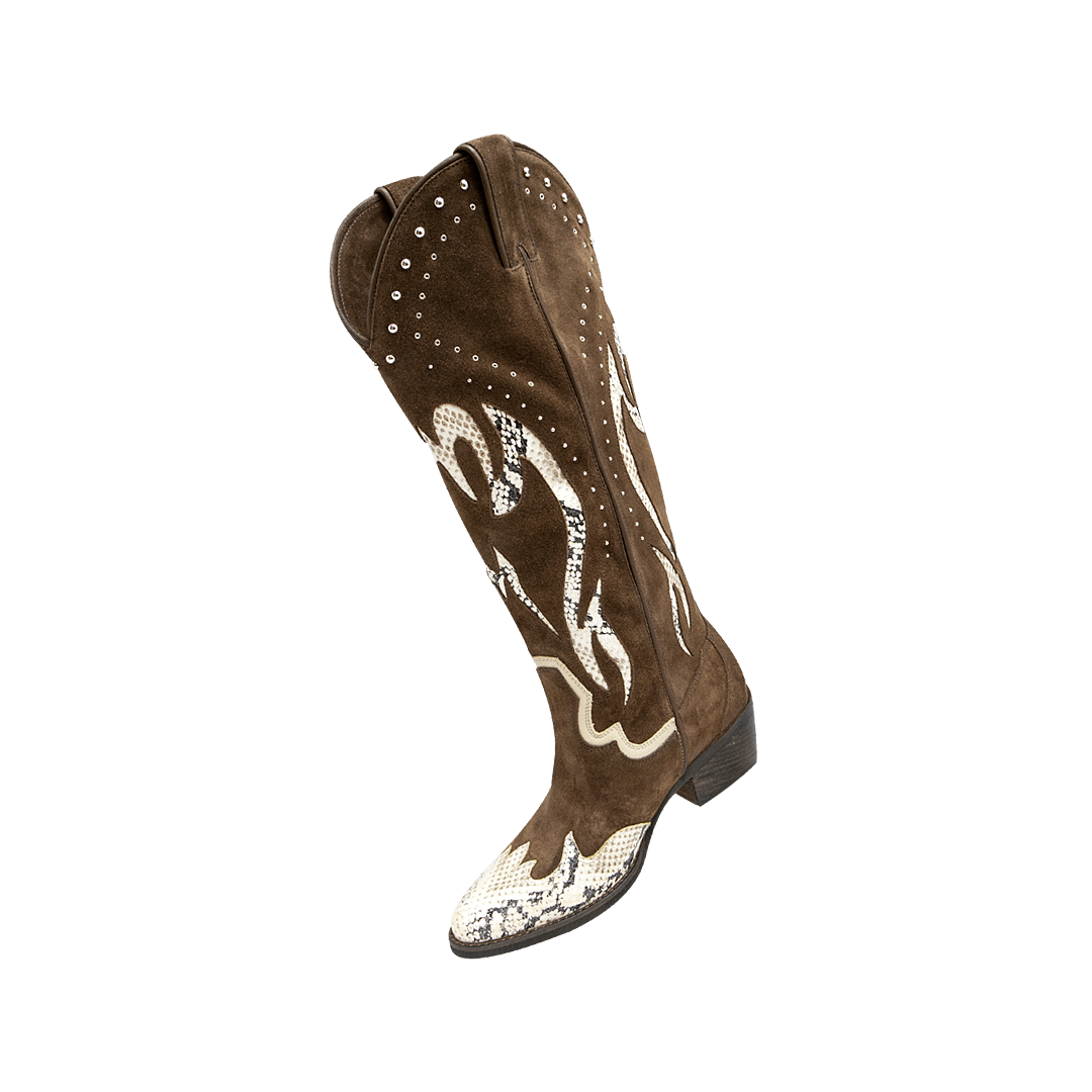 ¡Texanas, altas y con una energía protagonista! • Bota texana para mujer con taches y piedras de fantasía en cuero carnaza color chocolate • Acabado en punta • Bordados artesanales en cuero estampado imitación pitón • Tacón forrado en madera • Suela en caucho • Hecho en Colombia.