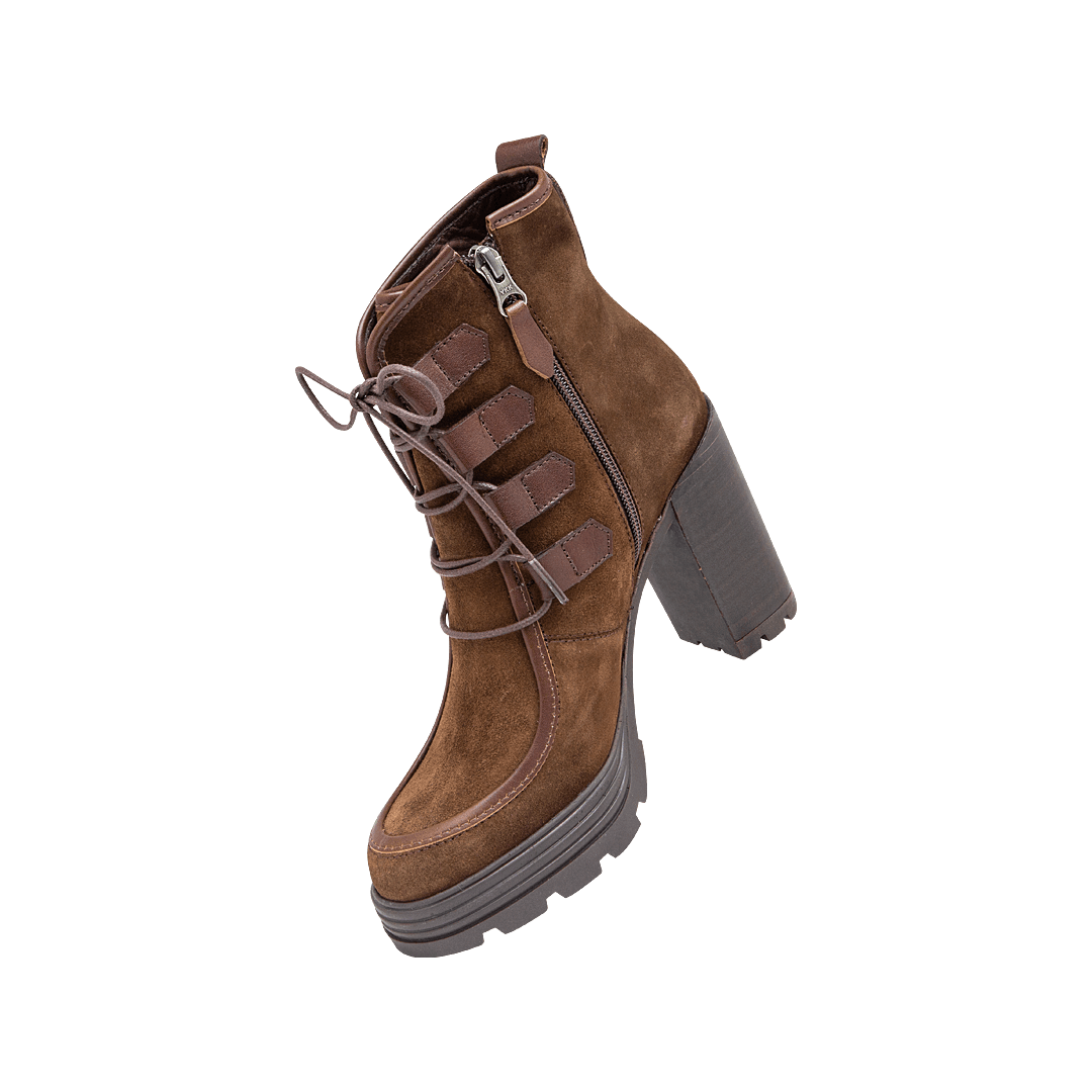 ¡Versátil y elegante! • Botín de atadura para mujer en cuero carnaza color chocolate • Acabado en punta redonda • Cierre lateral mediante cremallera • Plataforma dentada en caucho • Hecho a mano en Colombia.