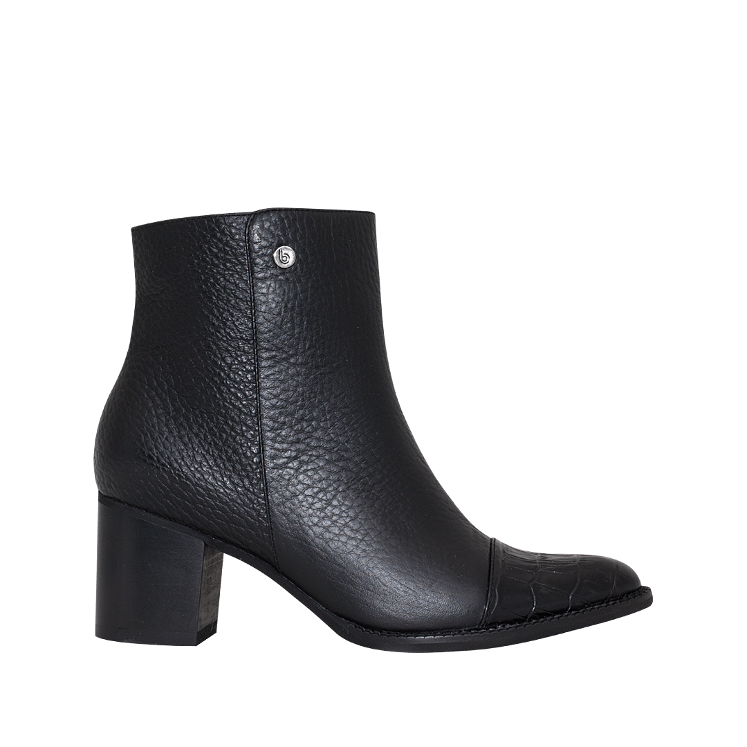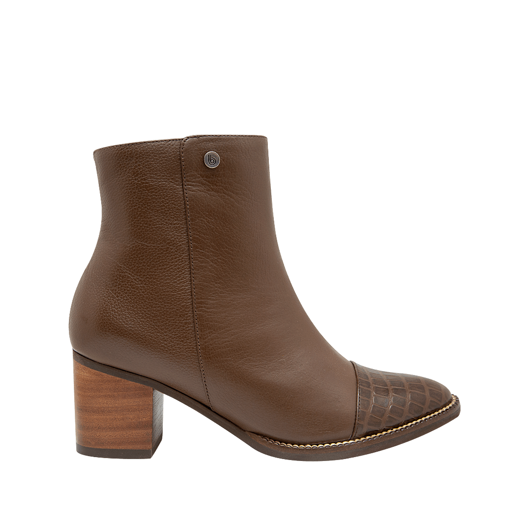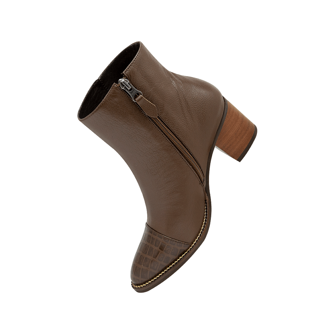 ¡Un básico que no te puede faltar! • Botín para mujer en cuero liso y croco color cacao • Acabado en punta • Cierre lateral mediante cremallera • Tacón en madera • Hecho a mano en Colombia.