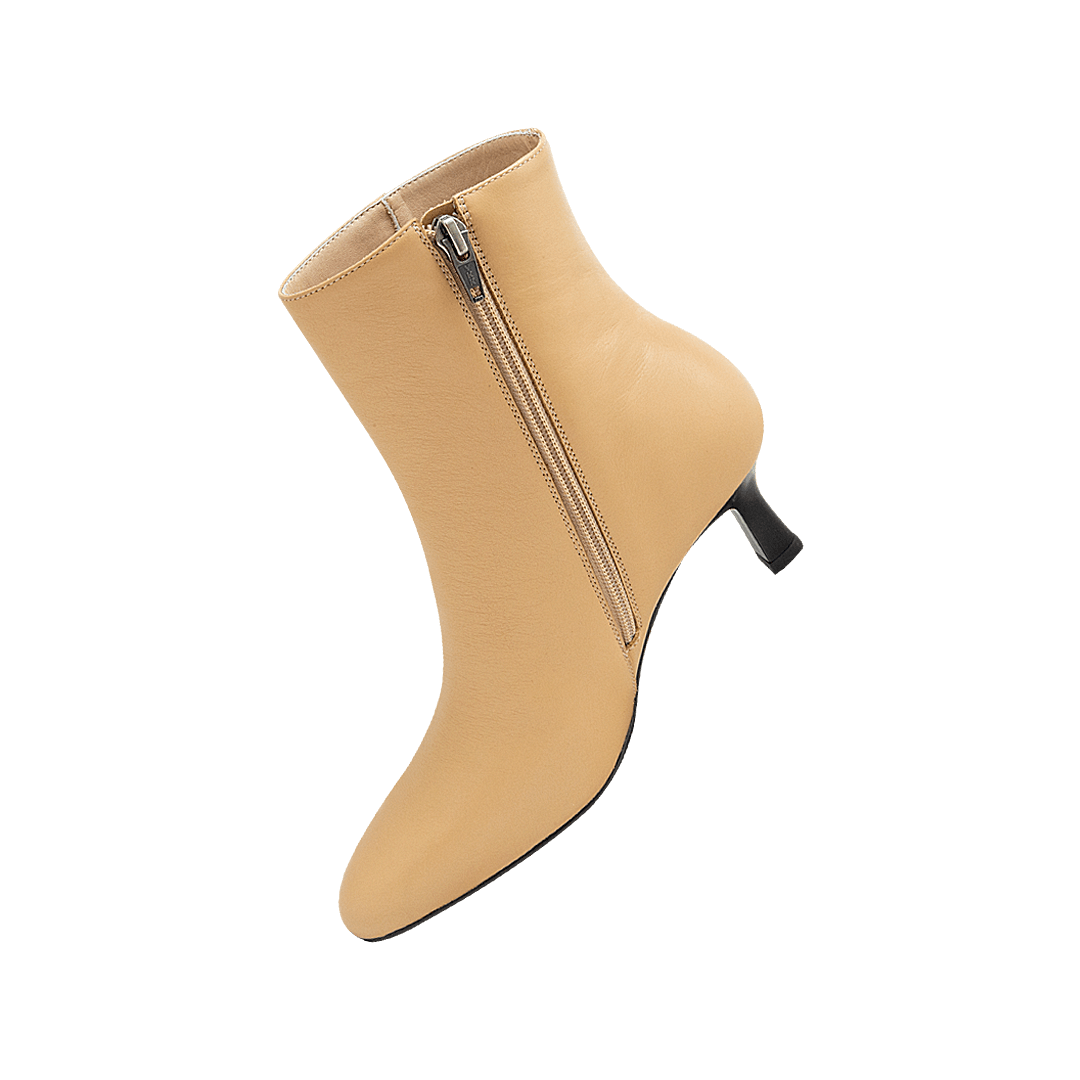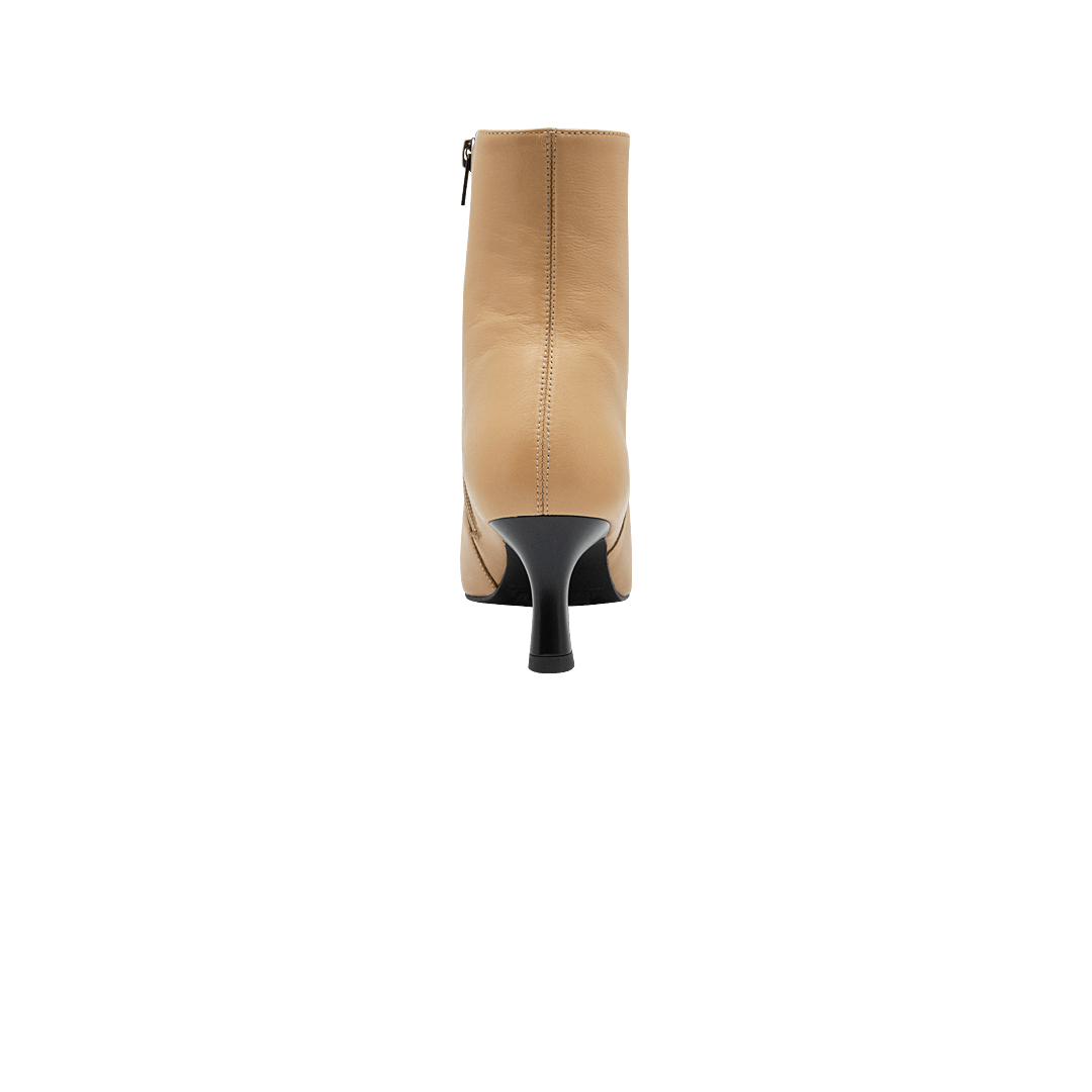 ¡Elegancia y sensualidad! • Botín para mujer en cuero liso color capuccino • Acabado en punta • Cierre lateral con cremallera • Tacón geométrico • Hecho a mano en Colombia.