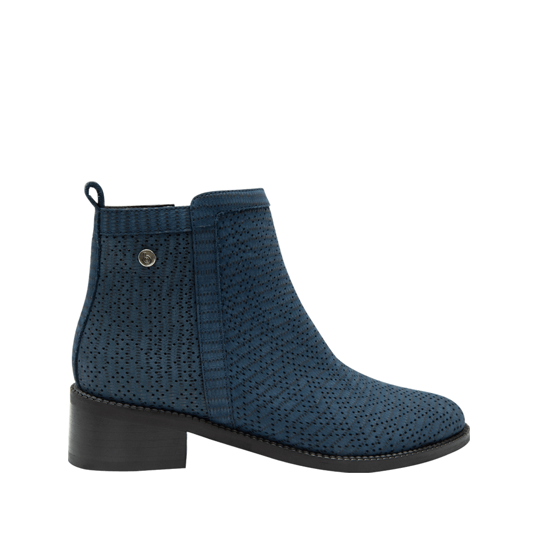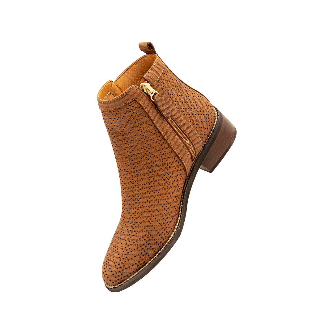 ¡Luce Fantástica! • Botín en cuero gamuzado perforado color canela • Acabado en punta redonda • Cierre lateral mediante cremallera • Tacón cuadrado forrado en madera• Hecho a mano en Colombia.