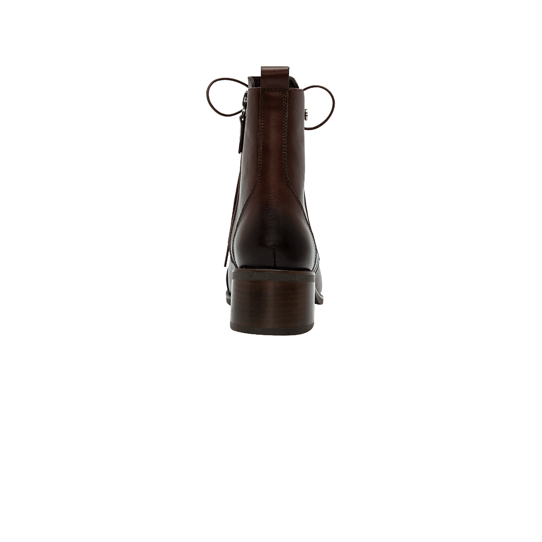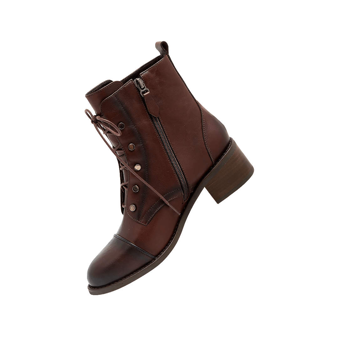 ¡Siempre a la moda! • Botín de atadura en cuero envejecido color marrón • Taches decorativos en la capellada • Acabado en punta redonda • Cierre lateral • Tacón en madera • Hecho a mano en Colombia.
