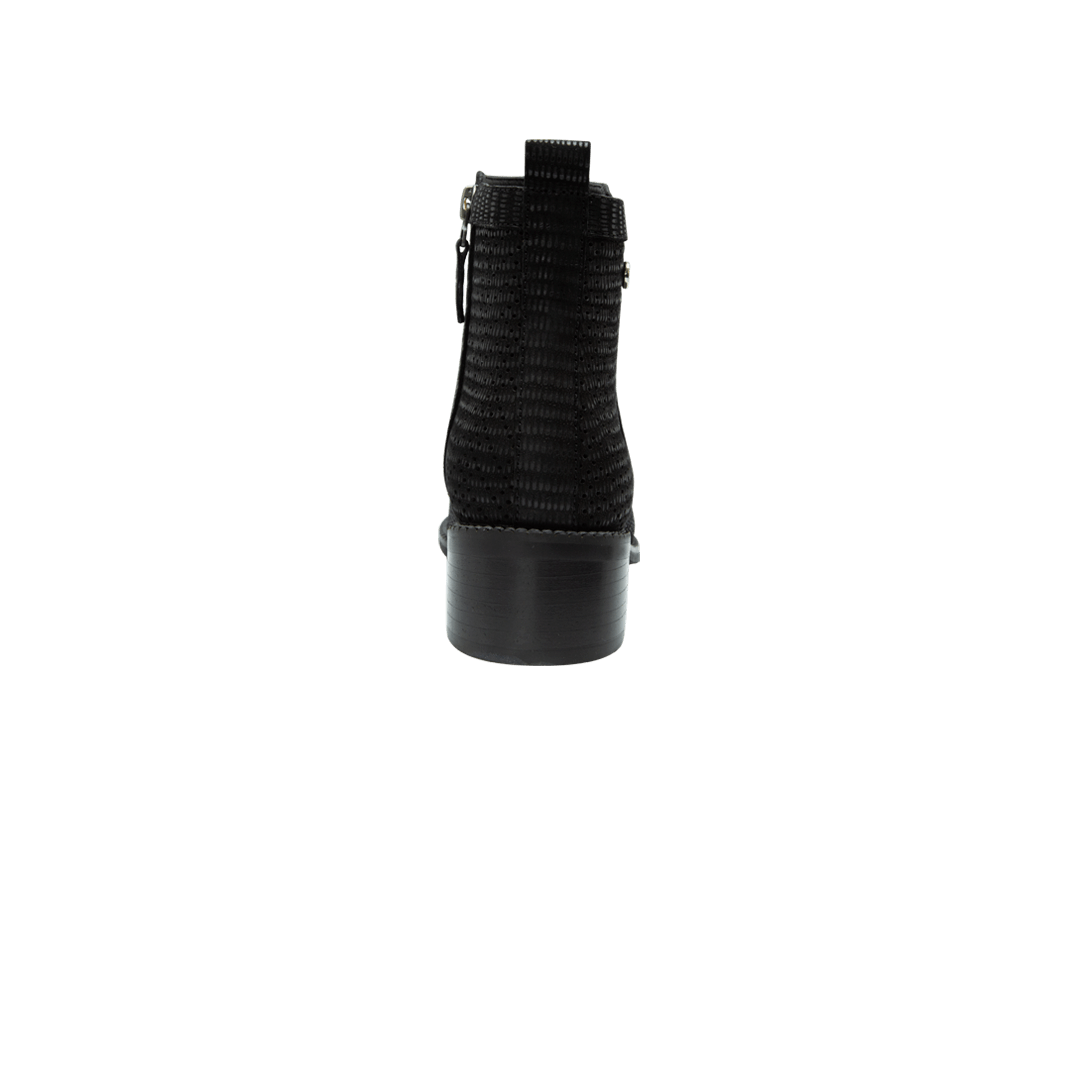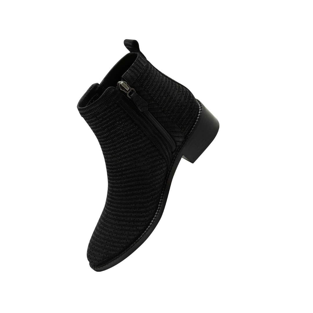 ¡Luce Fantástica! • Botín en cuero gamuzado perforado color negro ónix • Acabado en punta semiredonda• Cierre lateral mediante cremallera • Tacón cuadrado • Hecho a mano en Colombia.