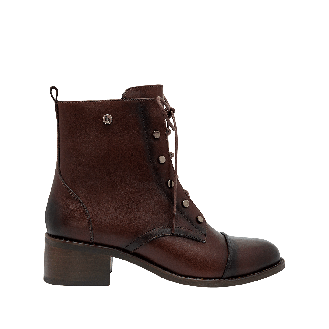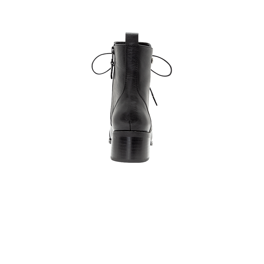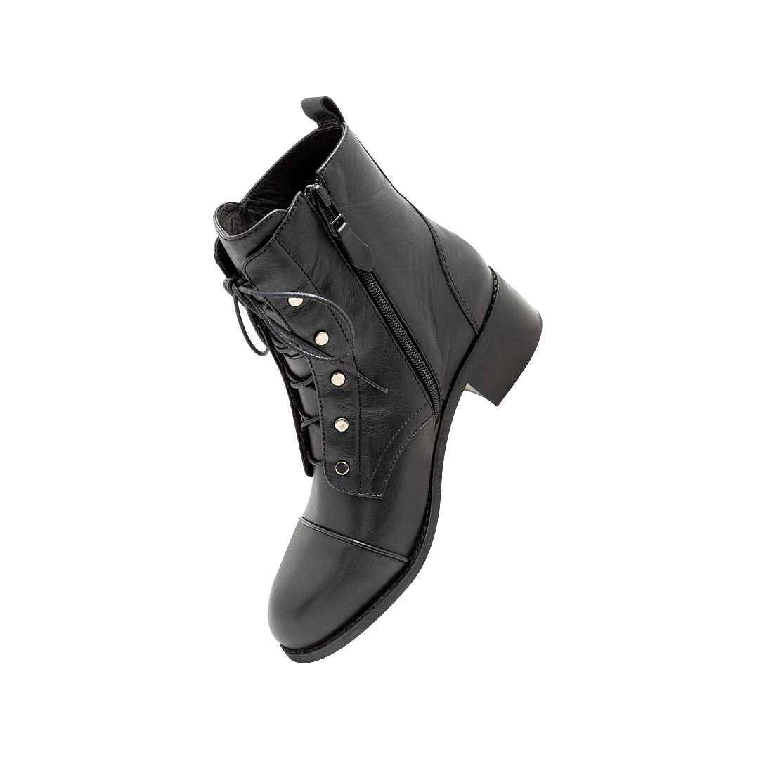 ¡Siempre a la moda! • Botín de atadura en cuero espasolado color negro ónix • Taches decorativos en la capellada • Acabado en punta redonda • Cierre lateral • Tacón en madera • Hecho a mano en Colombia.