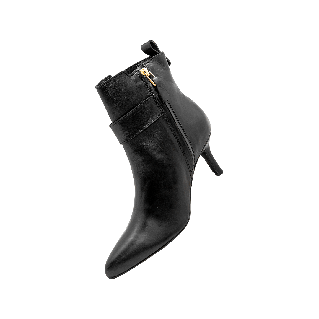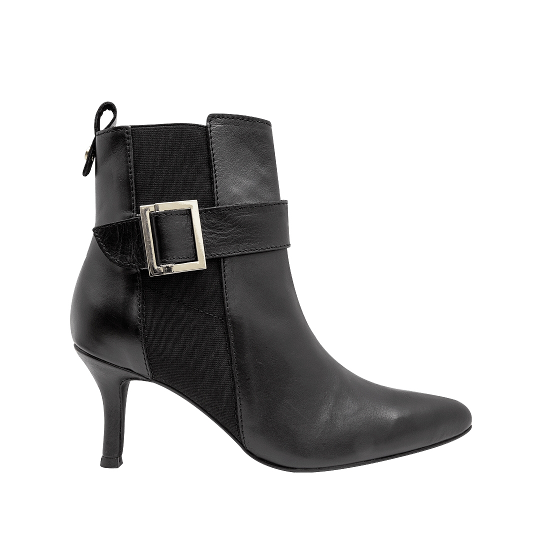 ¡Sexy y fashionista! • Botín para mujer en cuero liso color negro ónix • Acabado en punta • Cierre lateral con cremallera y elástico para mejor ajuste • Hebilla decorativa • Tacón aguja • Hecho a mano en Colombia.
