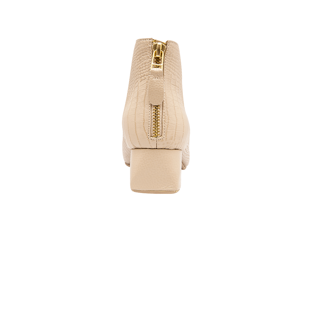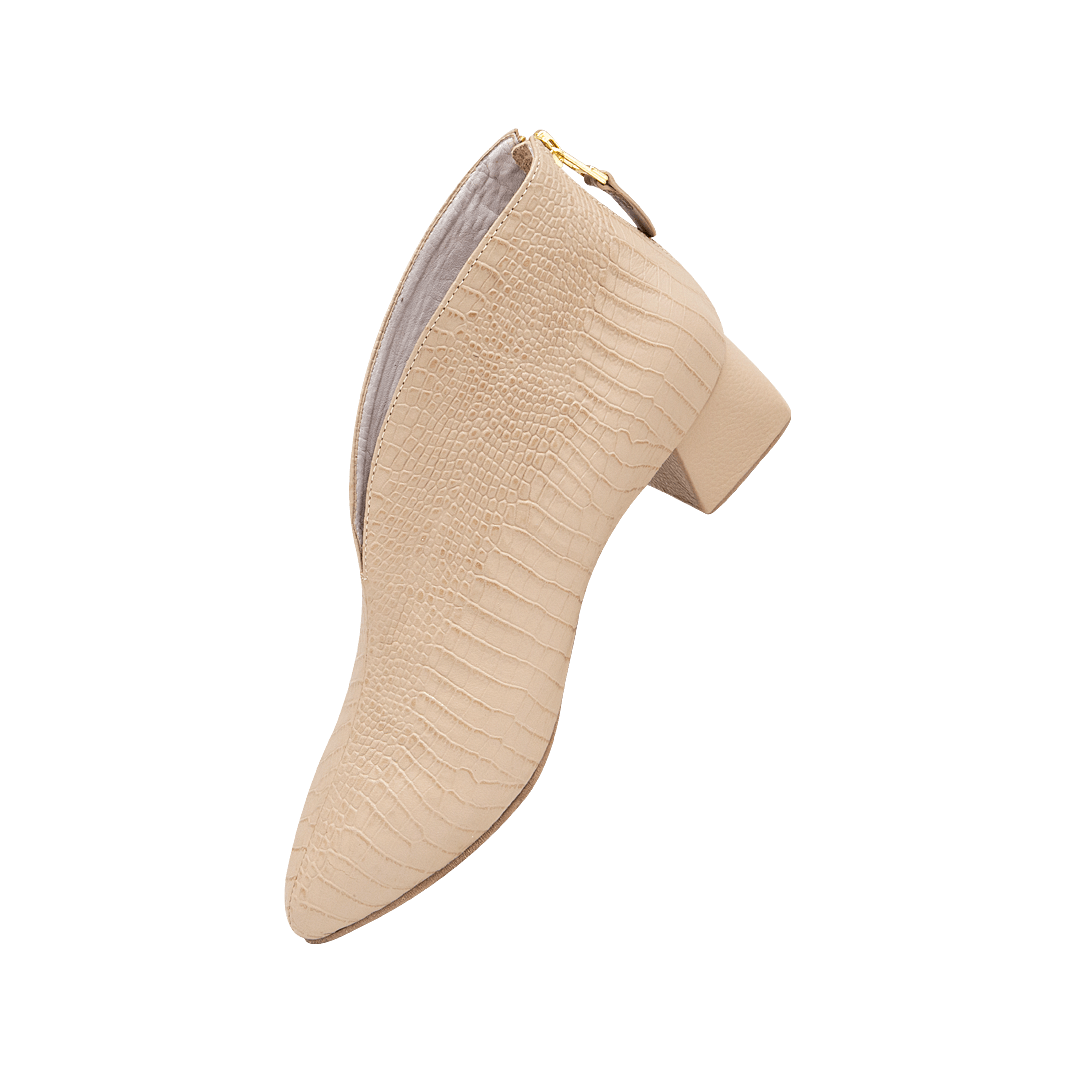 ¡Más que solo botas: son una declaración de estilo! • Botín para mujer en cuero grabado color pardo con escote en v • Acabado en punta • Cierre trasero • Tacón geométrico forrado en cuero • Hecho a mano en Colombia.