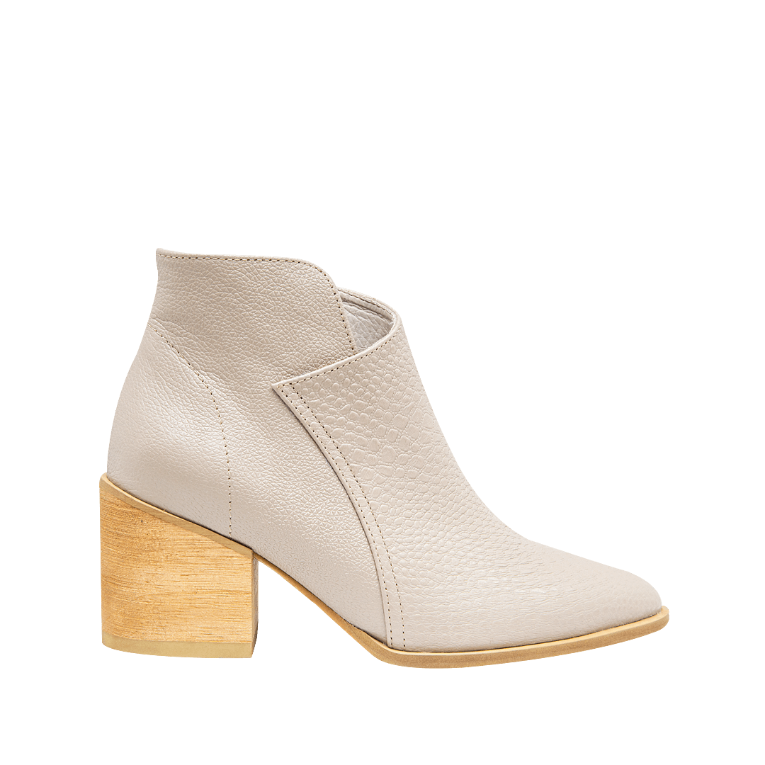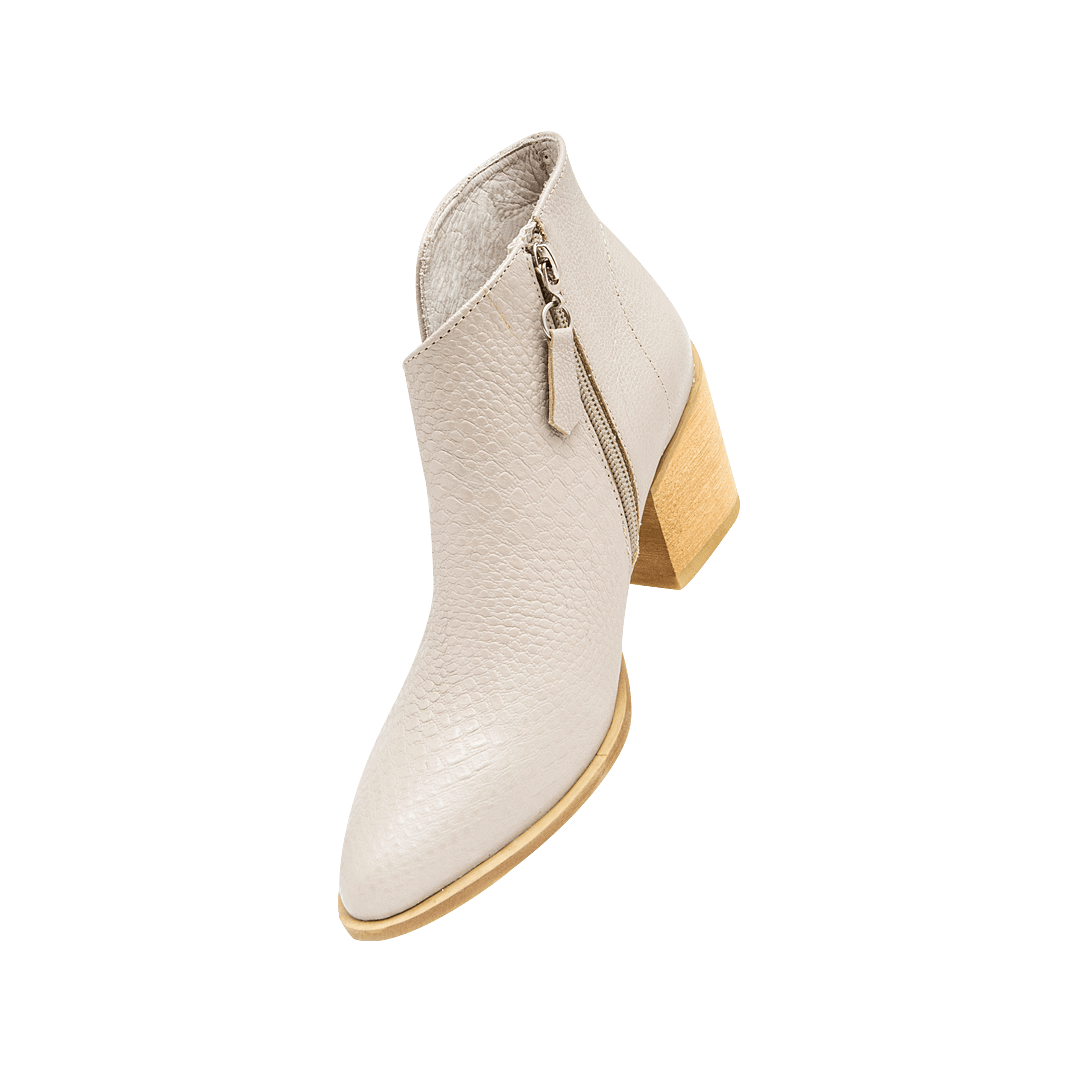 ¡Diseño sofisticado! • Botín para mujer en mezcla de cuero granito y grabado color rino • Acabado en punta • Cierre lateral mediante cremallera • Tacón cuadrado en madera • Hecho a mano en Colombia.
