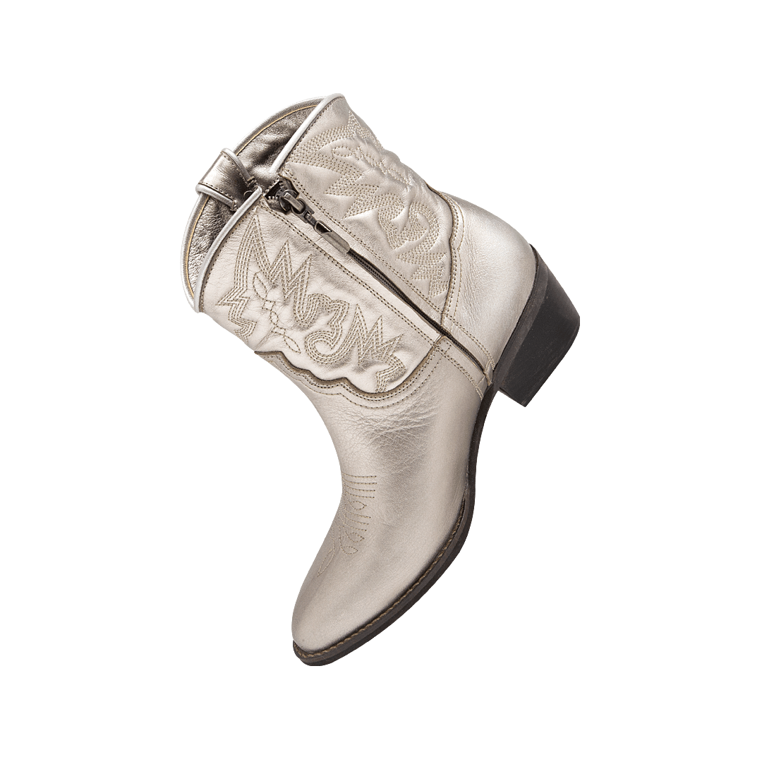 ¡Transforma cada paso en pasarela! • Botín texano para mujer en cuero metalizado color fusil • Acabado en punta • Bordados artesanales • Tacón forrado en madera • Suela en caucho para mayor comodidad • Hecho en Colombia.