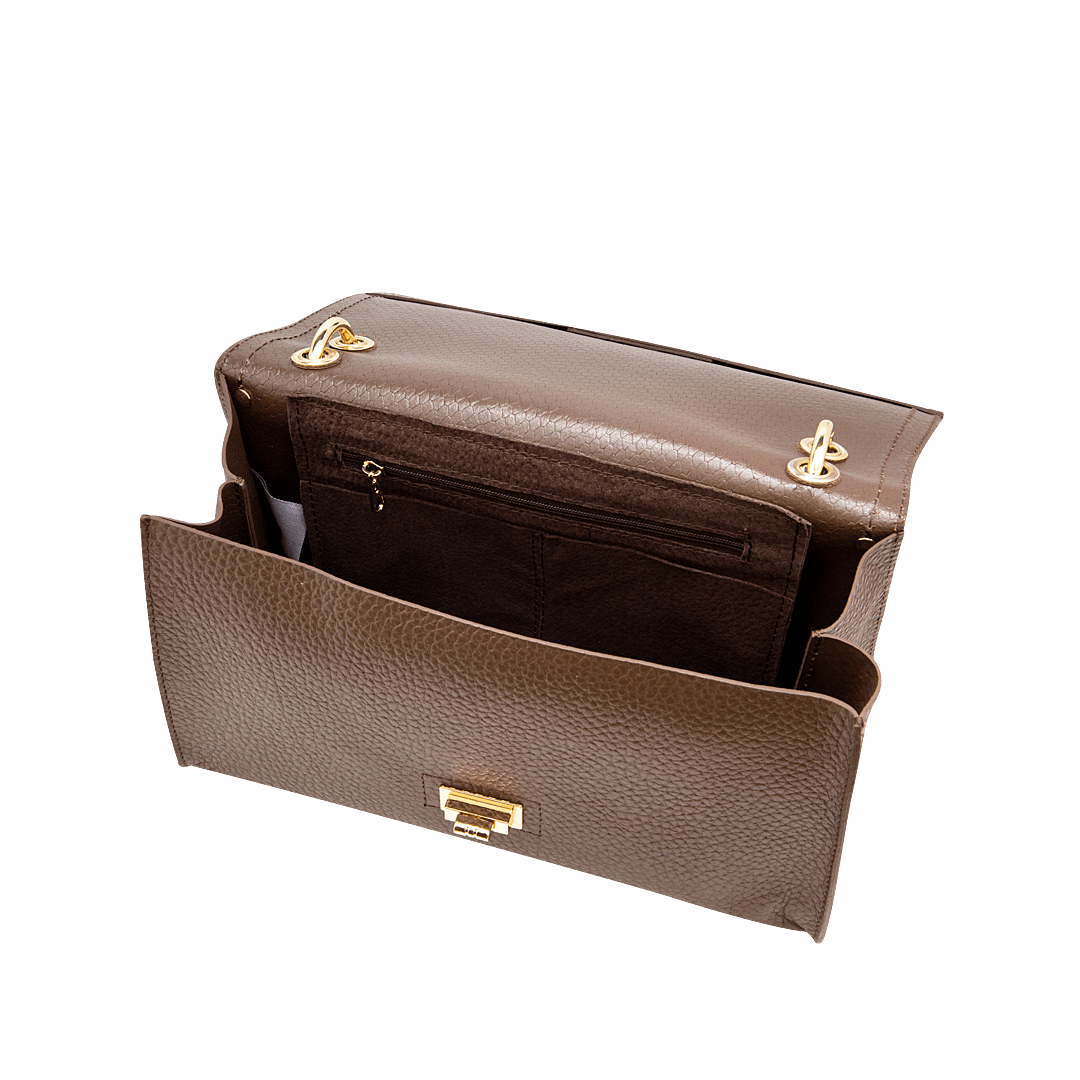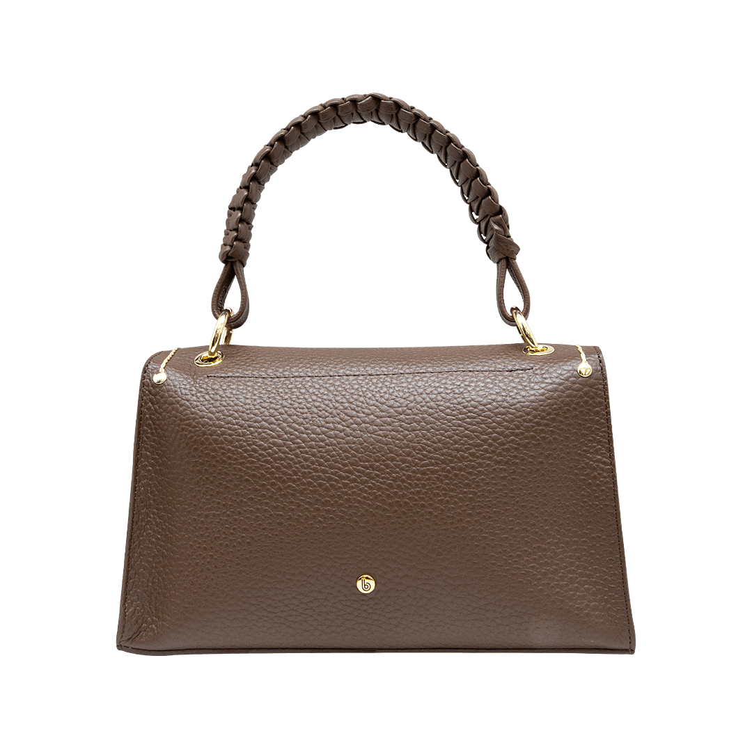 ¡Elegante y sofisticada! • Cartera para mujer en cuero granito color cacao • Cierre con tapa mediante broche • Compartimiento interno con cremallera • Dos bolsillos auxiliares • Asa corta removible en cuero trenzado de 38 cm • Asa larga ajustable y removible de 93 cm • Hecho a mano en Colombia.