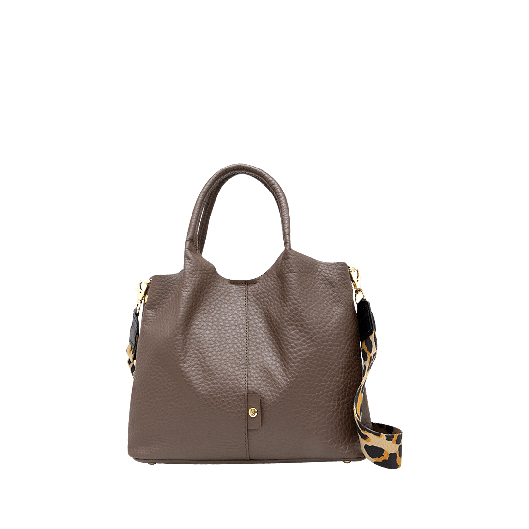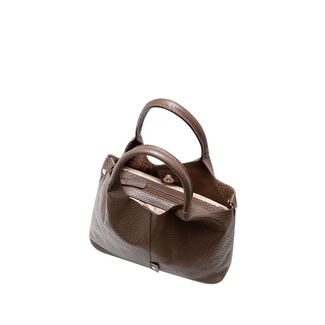 ¡Durabilidad y resistencia! • Cartera para mujer en cuero granito color cacao • Cierre mediante pin • Compartimiento interno removible con cierre mediante cremallera • Dos bolsillos auxiliares • Asa corta doble en cuero de 26 cm • Reata larga ajustable y removible de 116 cm • Hecho a mano en Colombia.