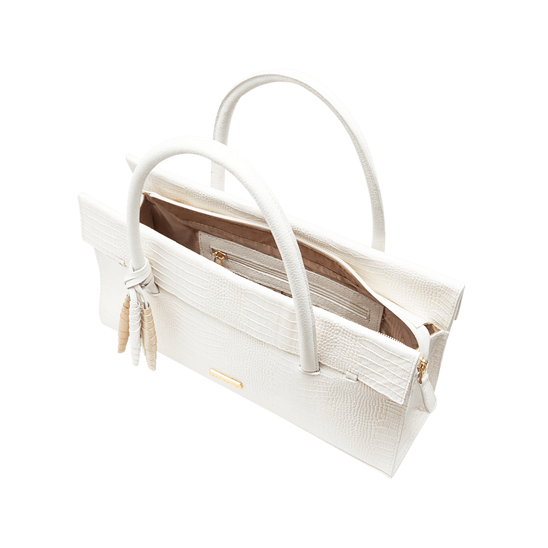 ¡Los pequeños detalles hacen la diferencia! • Cartera para mujer en cuero grabado color chantilly • Cierre mediante cremallera • Un compartimiento interno con cremallera • Un bolsillo auxiliar • Flecos decorativos en cuero • Asa corta doble de 47 cm • Asa larga removible de 71 cm • Hecho a mano en Colombia.