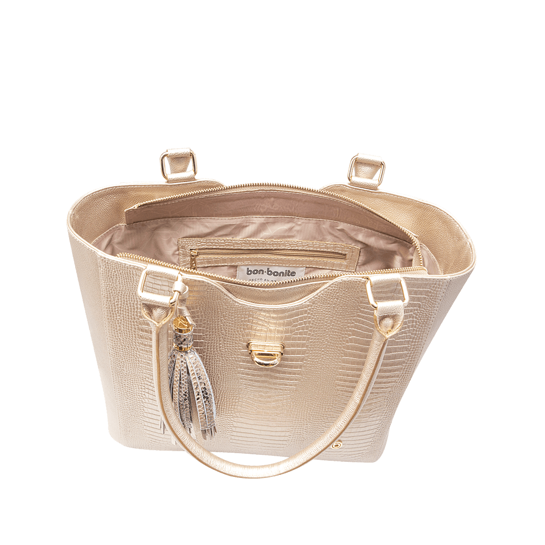 ¡Espacioso y lleno de estilo! • Cartera para mujer en cuero metalizado color oro • Cierre mediante cremallera y broche • Bolsillo interno con cremallera • Dos bolsillos auxiliares • Asa corta de 49 cm • Fleco decorativo en mezcla de cuero • Hecho a mano en Colombia.
