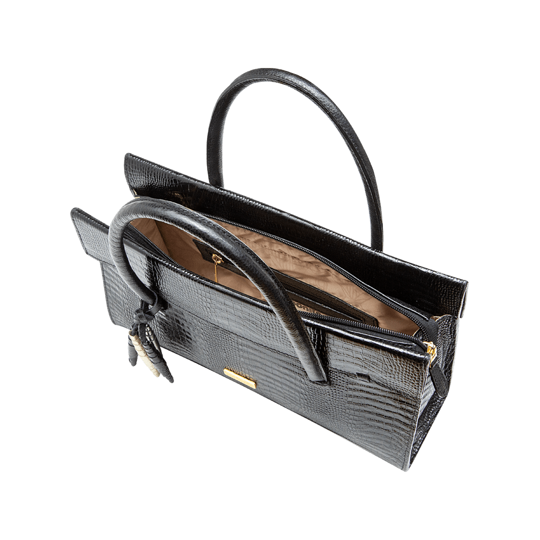 ¡Los pequeños detalles hacen la diferencia! • Cartera para mujer en cuero grabado color negro ónix • Cierre mediante cremallera • Un compartimiento interno con cremallera • Un bolsillo auxiliar • Flecos decorativos en cuero • Asa corta doble de 47 cm • Asa larga removible de 71 cm • Hecho a mano en Colombia.