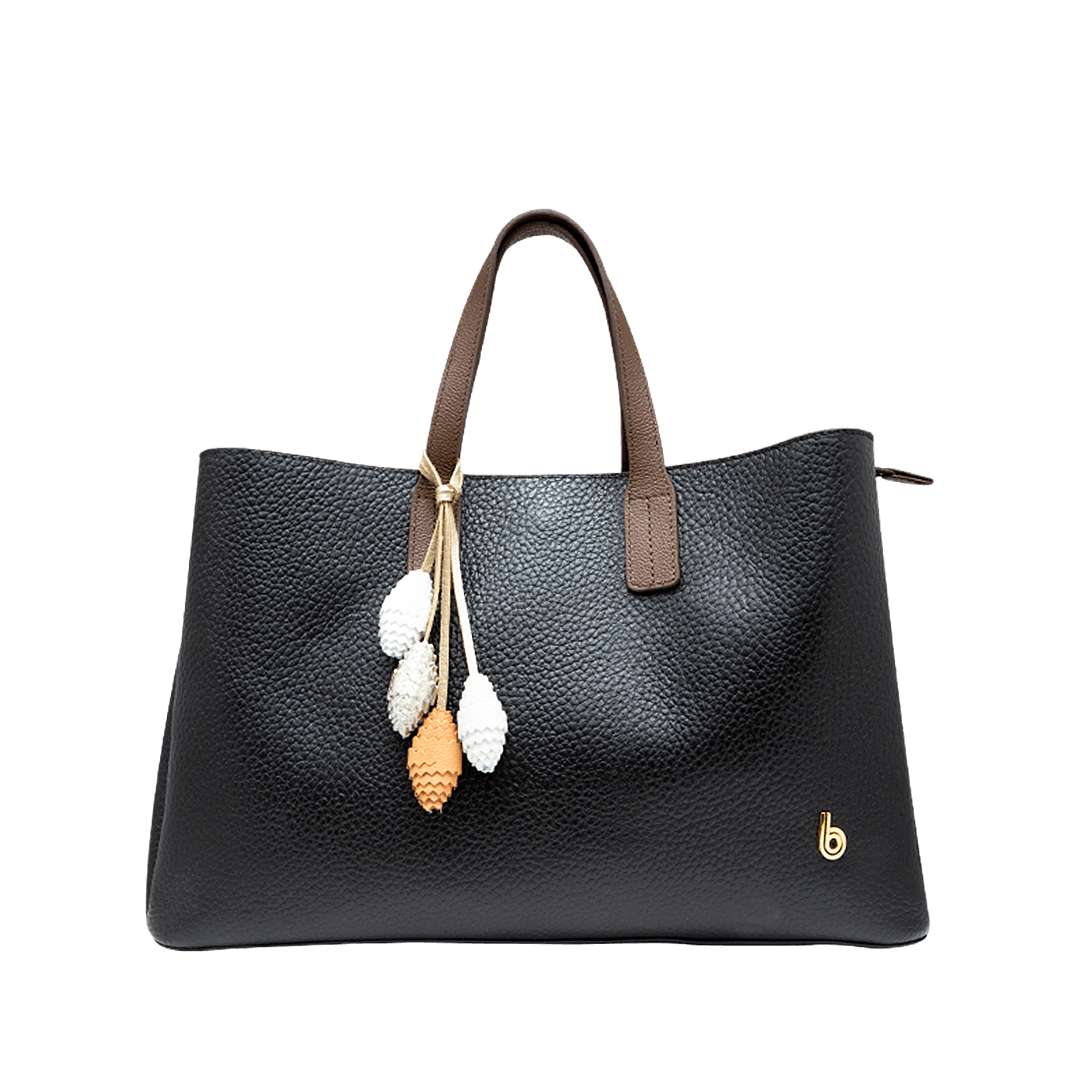 ¡Esto pasa cuando el diseño se atreve a ser diferente! • Cartera para mujer en cuero granito color negro ónix • Accesorio decorativo en cuero multicolor • Cierre mediante cremallera y pin • Un compartimiento interno con cremallera • Dos bolsillos auxiliares • Asa corta doble color cacao de 34 cm • Asa larga ajustable y removible de 100 cm • Hecho a mano en Colombia.